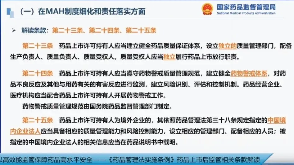 条例第25条:进一步明确境外持有人指定的境内责任人要求——一是应当具备法人资格;二是应当具备相应的质量管理能力和风险控制能力,且需设立相应机构、配备相应资源,推动持有人建立更加规范的质量管理体系,加强进口药品进入国内市场后的全流程管理。
