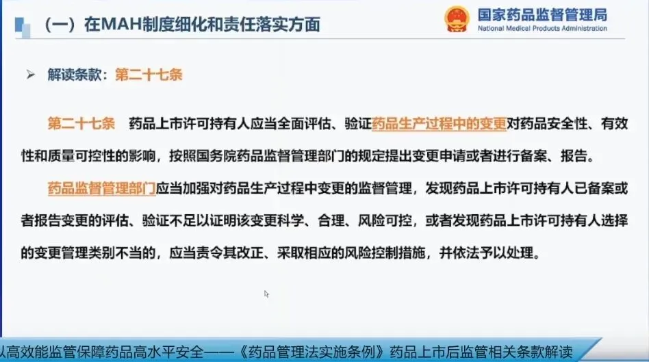4. 药品上市后变更管理:这是上市许可持有人全生命周期管理的重要内容,也是此次条例修订中业界高度关注的内容。药品上市后变更的目的,是进一步提升药品质量和安全风险可控性、提高生产效率,但必须防止变更过程中引入新的质量安全风险,且不得降低持有人对药品质量的控制要求。