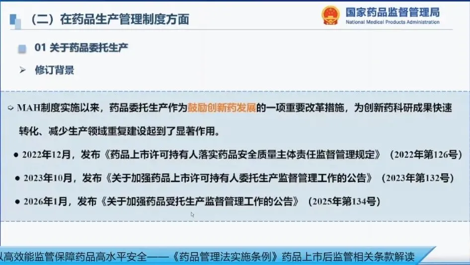 1. 药品委托生产:自药品上市许可持有人制度实施以来,药品委托生产作为鼓励创新药发展的具体措施,为创新药科研成果快速转化、减少药品生产领域重复建设发挥了显著作用。为进一步加强委托生产监管,明确各方责任义务,国家药监局前期陆续发布一系列文件,对持有人、受托生产企业及委托生产监督管理提出具体要求。