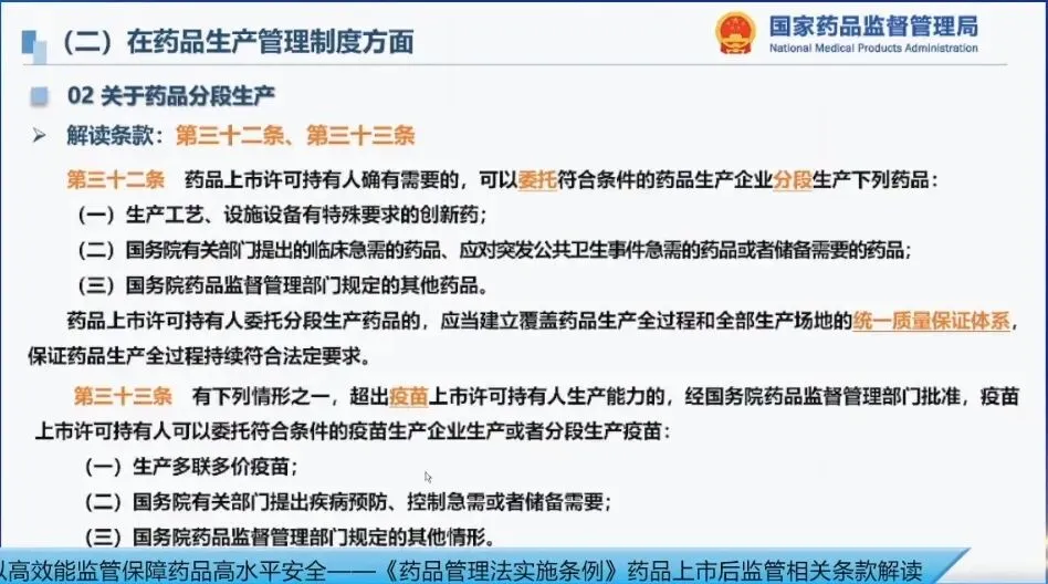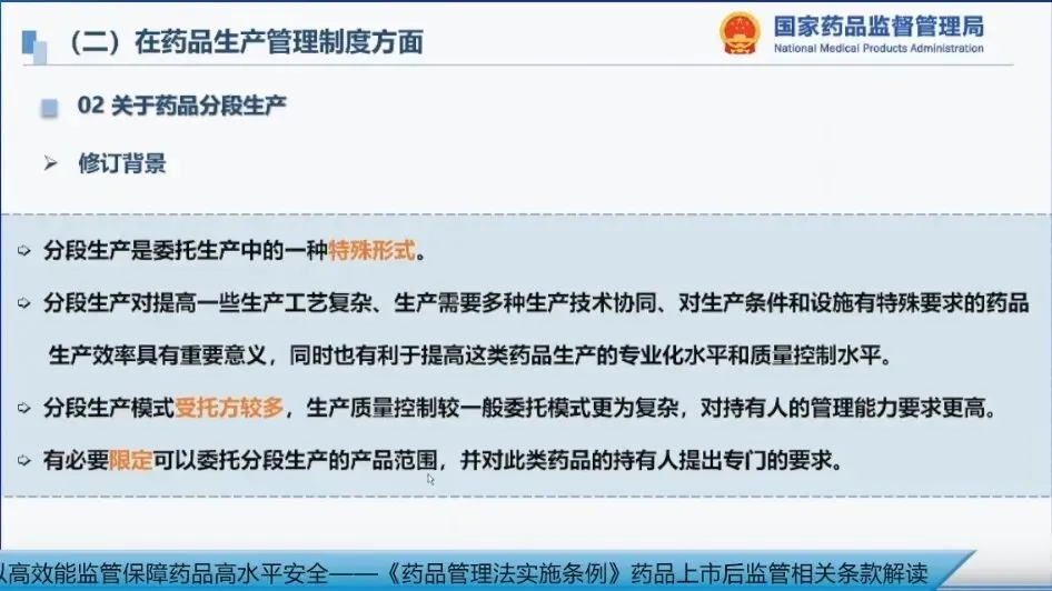 2. 药品分段生产:分段生产是委托生产的特殊形式,即持有人将药品生产过程按工序分成若干部分,分别委托不同受托方生产,这对提高生产工艺复杂、需多种技术协同、对生产条件有特殊要求的药品生产效率,提升专业化水平和质量控制水平具有重要意义。但由于分段生产受托方较多,质量控制难度更大,对持有人的管理能力要求更高,因此需限定适用范围并提出专门管理要求。