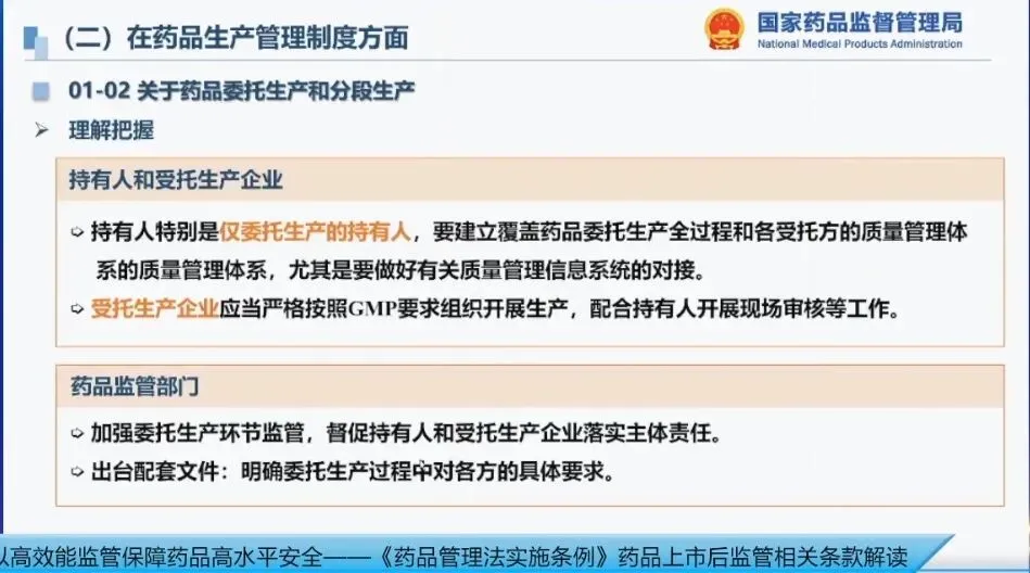 在此强调,持有人和受托企业需严格落实条例规定,对照国家药监局相关公告及指南要求履行义务、落实责任。持有人要建立覆盖委托生产全过程及各受托方的质量管理体系,做好与受托企业质量管理体系的有效衔接,统一标准开展质量管理,加强质量管理信息系统对接,全面管控药品生产、检验、放行全过程;受托企业要严格按照GMP组织生产,积极配合持有人开展现场审核等工作。药品监管部门将持续加强委托生产环节监管,后续还将出台配套文件,明确各方具体要求。