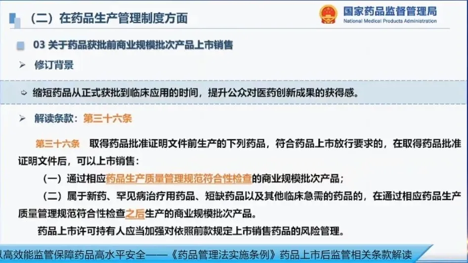 条例第36条规定,在严格保障药品质量安全的前提下,持有人在正式获得药品批准文件前,通过GMP符合性检查并符合上市放行要求的商业规模批次产品,可在药品获批后上市销售,具体分为两种情形:一是所有药品,通过GMP符合性检查的相应批次(即“检查批”)可上市销售,仅限接受现场检查的批次,不得拓展;二是新药、罕见病治疗用药、短缺药品及其他临床急需药品,通过GMP符合性检查后生产的商业规模批次(即“备货批”)也可上市销售。