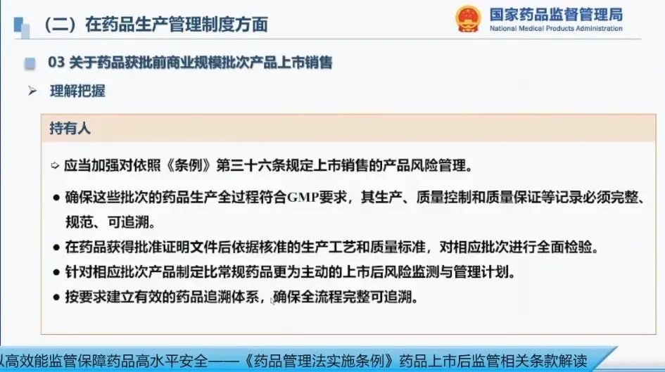 同时,条例明确持有人需履行相应风险管理义务:一是确保此类批次药品生产全过程符合GMP要求,生产、质量控制及检验记录完整、规范、可追溯;二是药品获批后,依据核准的生产工艺和质量标准,对相应批次产品进行全面回顾,确保符合上市放行标准;三是制定比常规批次更主动的上市后风险监测与管理计划,密切监测临床使用信息,及时识别、评估和控制潜在风险;四是建立有效追溯体系,确保药品全流程可追溯。