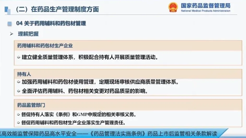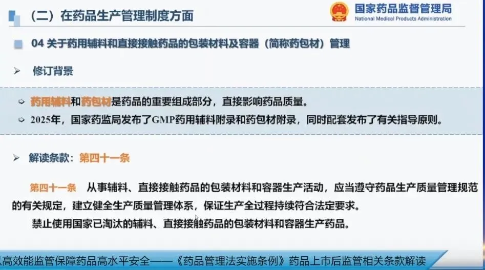 条例第41条从法规层面再次强调,药用辅料和药包材生产企业应当符合GMP有关规定,建立健全质量管理体系,保证生产全过程持续符合法定要求,通过规范生产过程,确保药用辅料和药包材产品性能稳定均一,保障制剂产品质量。