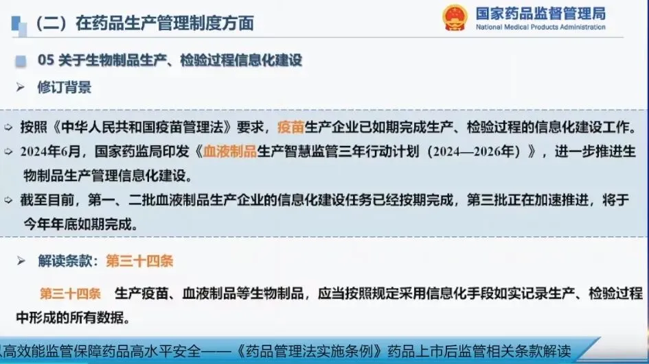 条例第34条在《疫苗管理法》及血液制品生产质量监管要求的基础上,进一步将血液制品生产检验数据信息化要求作为法定义务,明确生物制品生产企业应采用信息化手段,如实记录生产和检验过程中形成的所有数据。这一规定将推动持有人和生产企业提升信息化管理水平,实现更严格的质量管控、更准确的质量评估和更高效的监督管理,为提升生物制品生产质量管理能力和风险防控能力奠定基础。