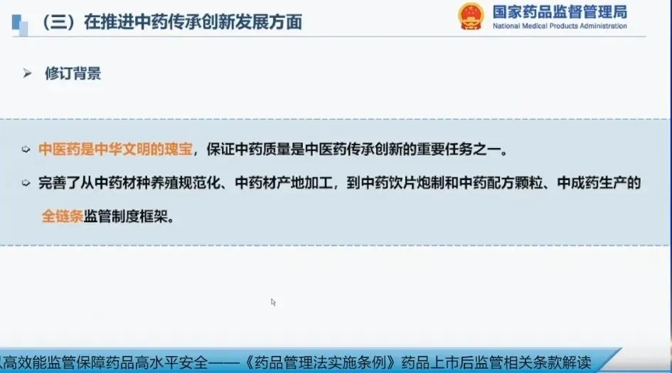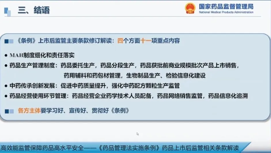以上围绕药品上市许可持有人制度细化及责任落实、药品生产管理制度、中药传承创新发展、药品经营使用环节管理四个方面,对条例修订的重点内容进行了解读。总的来说,新修订的条例旨在以严的标准保障药品安全,以改革精神优化监管服务,确保人民群众用药安全有效,支持医药产业高质量发展。