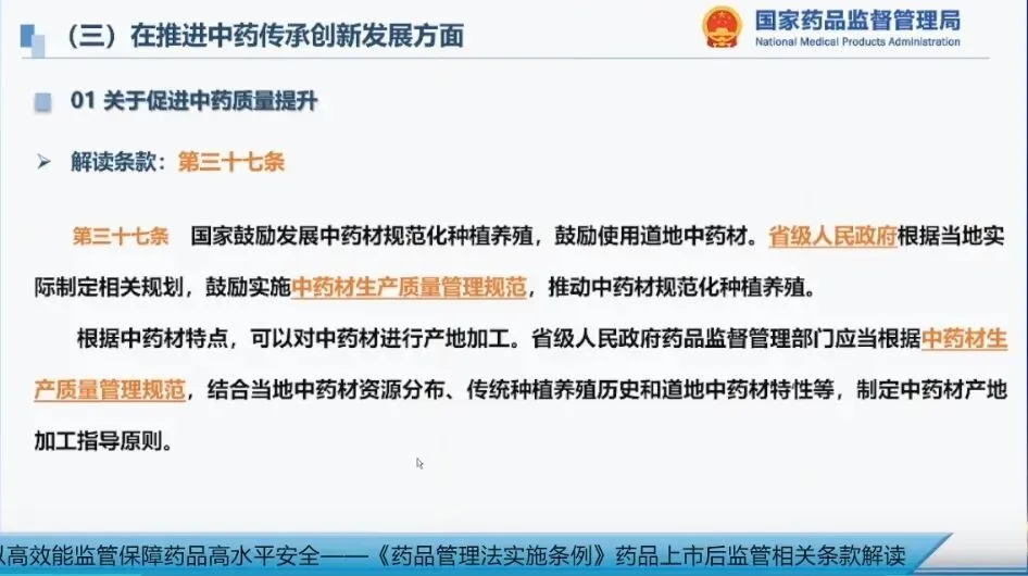 条例第37条第一款结合中药材种养殖产业特点,首次从法规层面明确,省级人民政府应当根据地方实际制定相关规划,鼓励实施中药材生产质量管理规范(GAP),推动中药材规范化种植和养殖,为GAP推广实施和中药材产业高质量发展提供法规依据,助力提升中药材种养殖规范化、标准化水平。