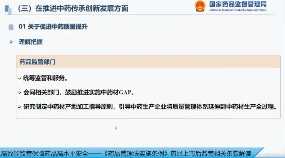药品监督管理部门将统筹监管与服务,会同相关部门继续鼓励推进中药材GAP实施,结合实际制定中药材产地加工指导原则,引导中药生产企业将质量管理体系延伸至中药材生产全过程。