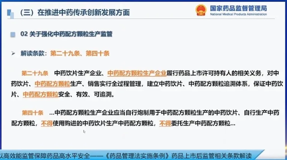 条例第29条结合中药配方颗粒生产、经营和使用特点,明确中药配方颗粒生产企业履行持有人相关义务,强调实行全过程管理并建立追溯体系;条例第40条进一步规定,中药配方颗粒生产企业应当自行炮制用于生产的中药饮片、自行生产中药配方颗粒,不得购进中药饮片生产中药配方颗粒,也不得委托生产。