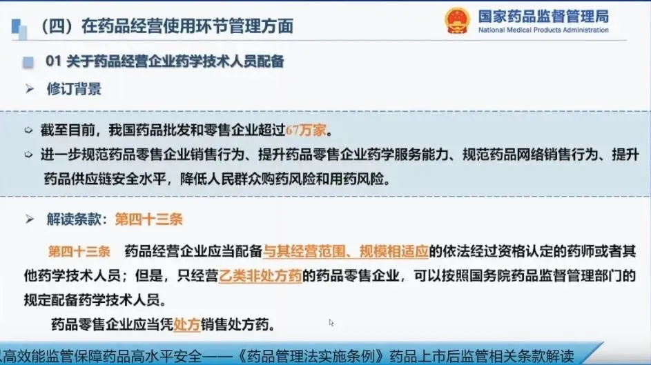 条例第34条在《药品管理法》基础上,进一步强调药品经营企业对药学技术人员的配备要求,旨在更好发挥药学技术人员在药品批发、零售企业中的质量管理和合规管理作用,提升药品零售企业药学服务水平,降低零售环节用药风险,保障公众用药安全。