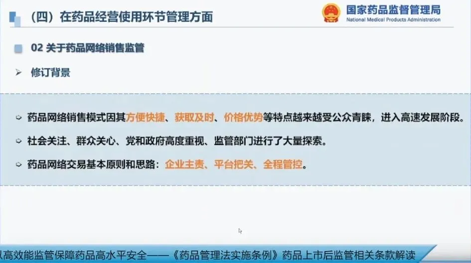 2. 药品网络销售监管:近年来,药品网络销售因方便快捷、价格优惠、配送及时等特点受到大众青睐,但作为新兴业态,其发展过程中也出现了一些问题,亟需明确各方义务和行为规范,保障行业健康可持续发展和公众用药安全。此次条例修订,在《药品管理法》基础上,确立了“企业主责、平台把关、全程管控”的原则,进一步细化监管要求。