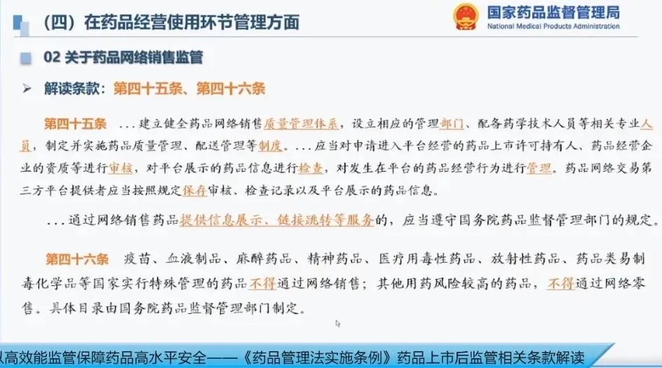 条例第46条进一步强化风险防控,对网络销售药品类别作出限制,将此前《药品网络销售监督管理办法》及网络禁止销售清单的相关要求上升至法规层面,明确了不得通过网络销售或零售的药品类别,加大监管力度,同时为今后根据实际情况优化完善禁售范围留出空间。