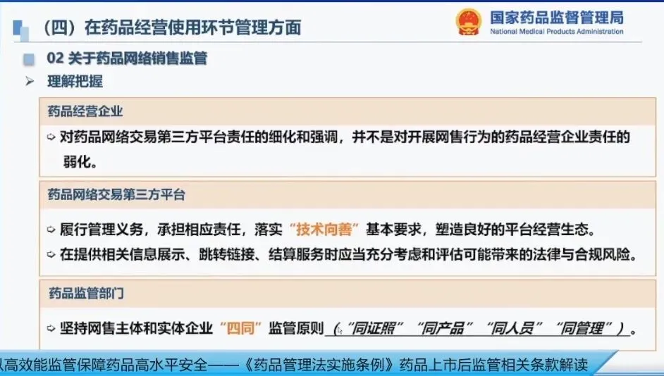 一是平台责任的细化的同时,并未弱化网售药品经营企业的责任。平台通过发布药品信息、撮合交易获取利益,理应履行管理义务、承担管理责任,包括及时发现和制止影响药品安全的销售行为,按要求保存审核记录和展示样品信息。平台应发挥技术和算法优势,将监管要求固化为算法规则,落实“技术向善”要求,塑造良好经营生态,尤其要建立在线预警监测和销售阻断机制,对监管部门明确禁售的药品,有效识别、拦截违法违规销售行为。