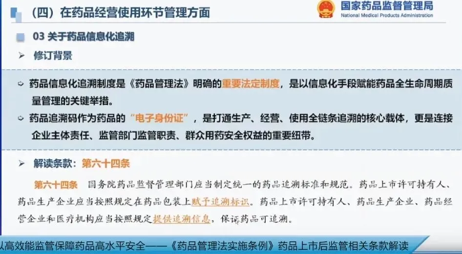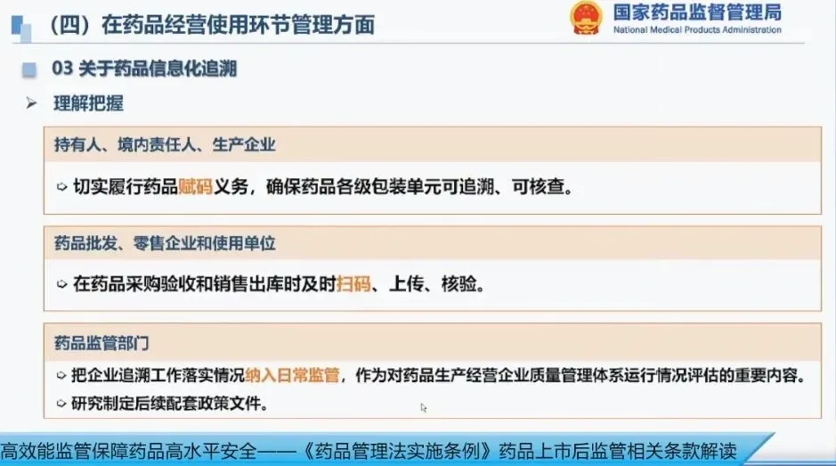 3. 药品信息化追溯:药品信息化追溯制度是《药品管理法》明确的重要法定制度,是以信息化手段赋能药品全生命周期质量管理的关键环节。药品追溯码作为药品的“电子身份证”,是打通生产、经营、使用全链条信息的核心载体,也是连接企业主体责任、监管部门监管职责和群众用药安全权益的重要纽带。