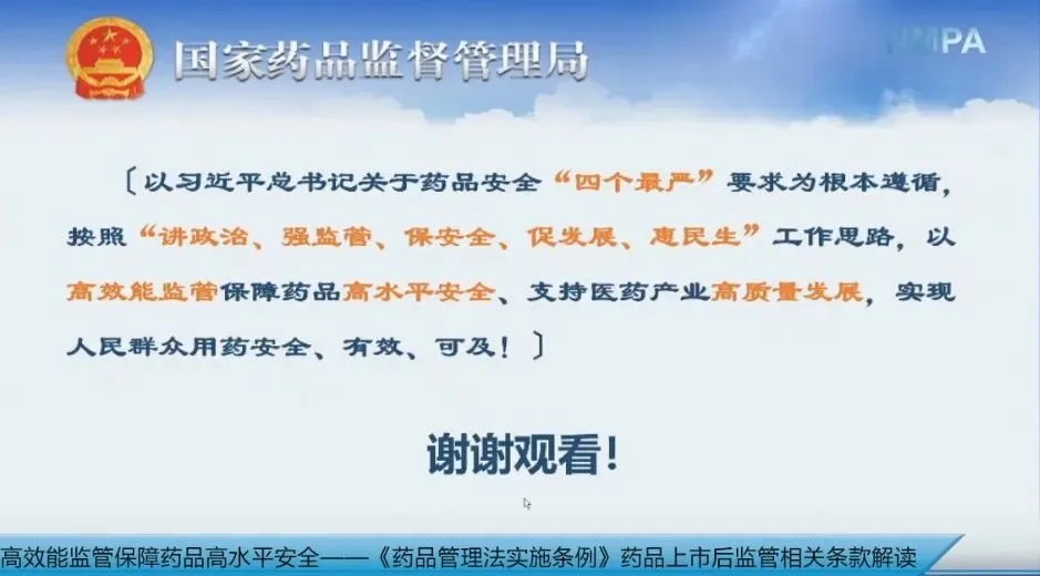 学习好、宣传好、贯彻好条例,是当前和今后一个时期,各级政府及有关部门、药品上市许可持有人、药品生产经营企业、医疗机构,以及各行业协会和学会的共同责任。下一步,我们将以“四个最严”为根本遵循,以新修订条例实施为契机,加快配套规章制度制修订工作,进一步完善药品上市后监管法规制度和标准体系;认真贯彻落实药品上市后监管各项要求,将条例具体规定转化为药品安全治理实效,不断增强产业界和广大人民群众的获得感。