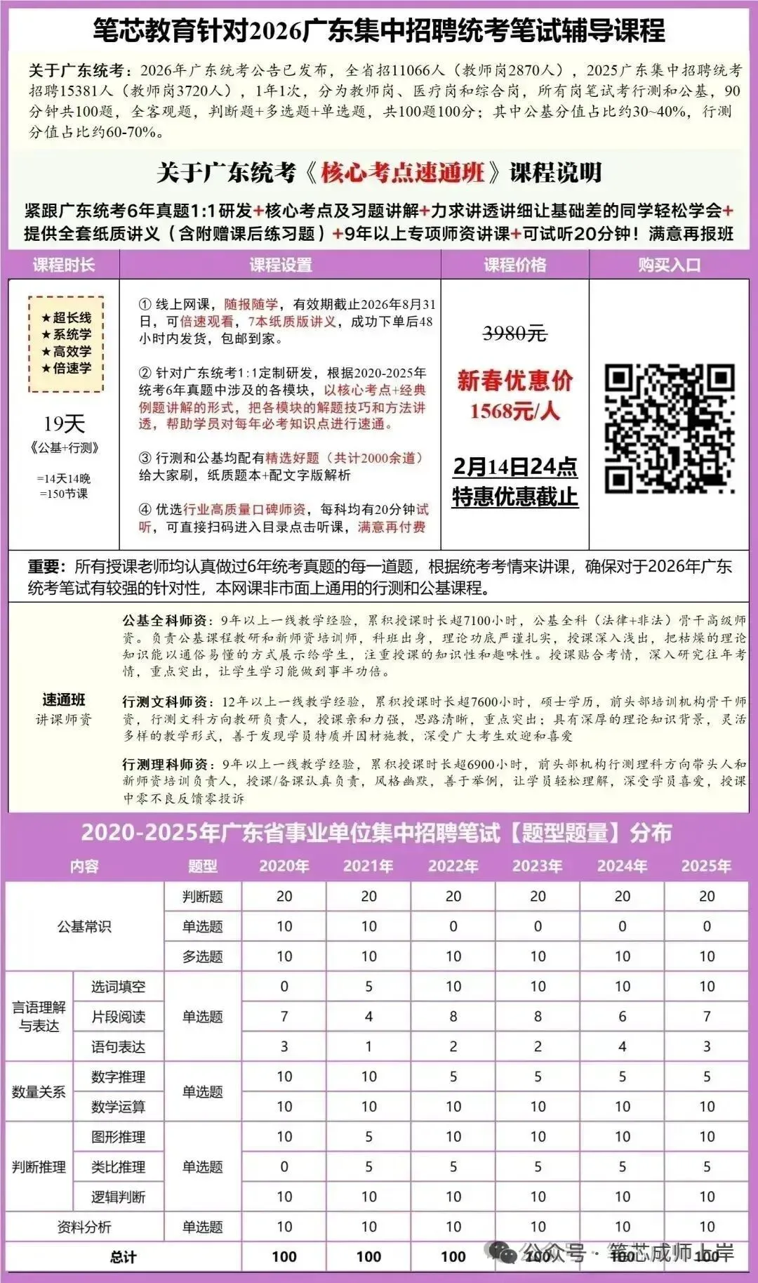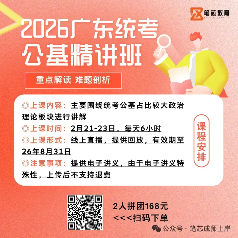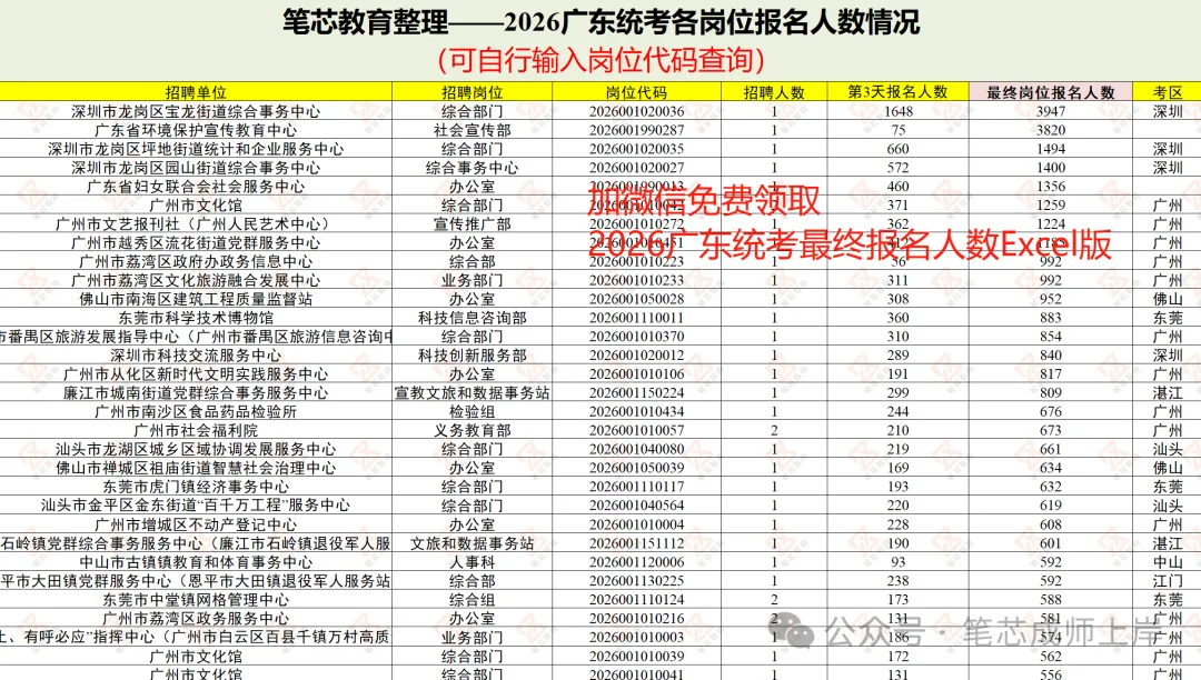 广东统考往年官方都是直接公布各岗位的最终报名人数,而今年每个岗位只能看到自己岗位的,为了满足大家的好奇心理,笔芯老师经过3天的时间(结合网上和同学们的反馈),整理了不少岗位的最终报名人数,有需要的同学可以添加微信免费领取。2026年广东统考竞争最激烈的岗位是深圳龙岗区宝龙街道综合事务中心,最终共3947人报名,竞争比为3947:1;2025年广东统考竞争最激烈的岗位是广州市文艺报刊社(广州人民艺术中心),最终共1170人报名,竞争比1170:1。今年最激烈的3947人与去年最激烈的1170人相比,多了3倍不止,让大家狠狠震撼了,虽然缩招,但广东统考报考热度依旧很猛。结合目前部分岗位最终报名人数来看,离2月4号最后公布报名人数总体涨幅平均在3-5倍之间,若以比较保守的数字翻3.5倍来计算的话,今年广东统考的最终报名人数也至少达到了65w+。不过按照目前情况来看,今年人数肯定不止这个数(招考量少了+报名人数增加,竞争更大了),可能是考虑到这个情况,今年广东统考居然提前发布了笔试通知,而且是跟外省公务员联考撞期(往年很少撞),估计周边省份的同学会放弃广东统考,最终广东统考的实际考试人数预估跟往年差不多,想考2026广东统考的同学,不要被报名人数吓到,你认真准备,结果可能会超出你的预期,下面有各类备考资料,需要的可以看看。-----------------------------------------统考笔试无论报什么岗位,都是考公基+行测,所有岗位一个卷。公基占比30%,行测占比70%。一个月的时间内想要高效备考,一定不能犹豫,先学起来很重要!广东统考中公基占比30%,想要有效复习公基板块,推荐公基精讲班,2月21-23日线上开课,主要围绕公基占比较大的政治理论进行讲解,2月21日前报名,2人拼团168元,具体可扫码查看课程详情:
