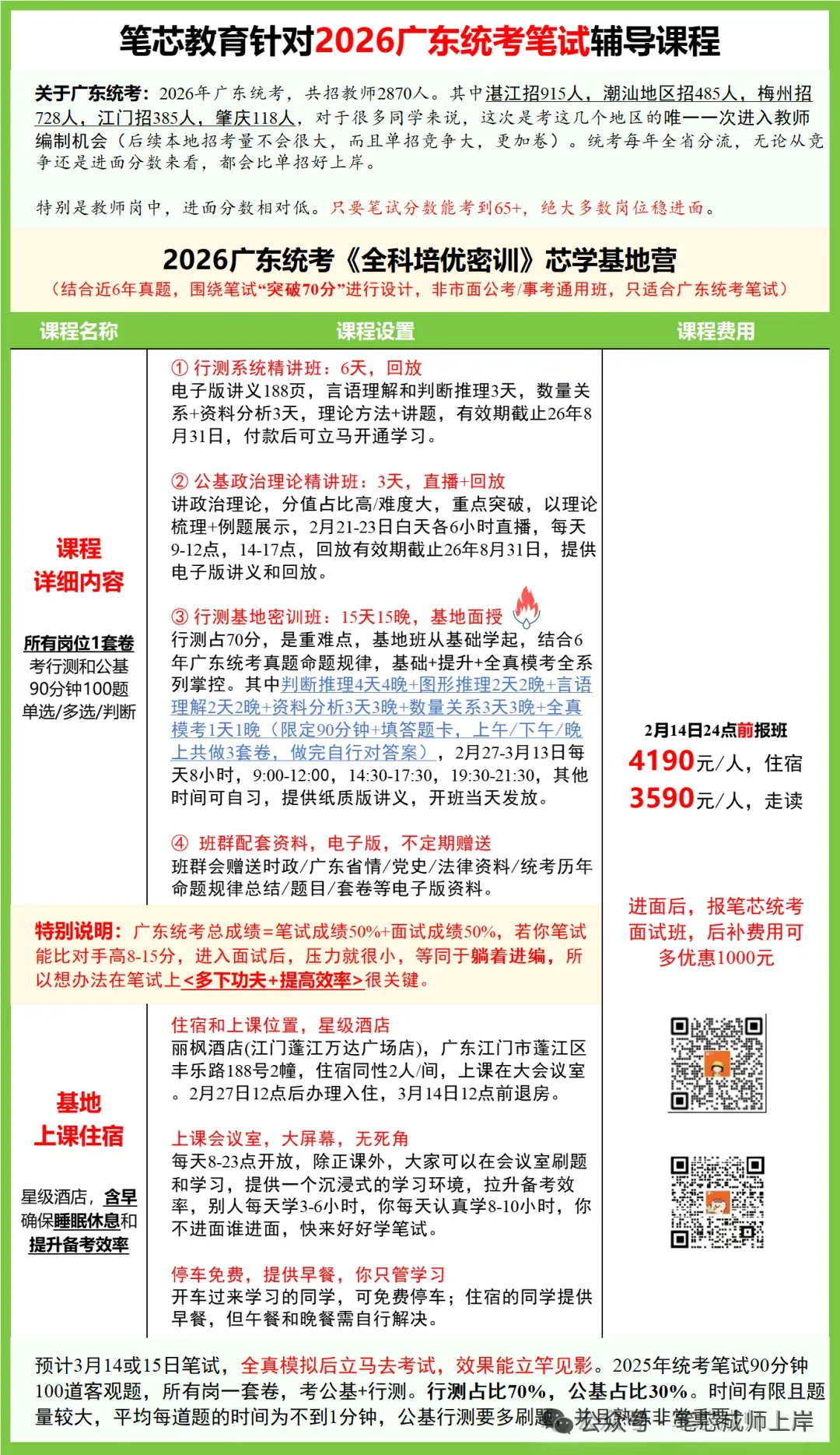 统考教师岗进面分数低,能考到65分,90%岗位可以进面。若你想要在今年统考上岸,推荐大家报统考面授基地班。课程根据近6年统考考情定制,围绕突破“70分”进行设计,线下15天含住集训,从基础-提升-全真模考全系掌控。基地班限招60人,满人封班。目前还剩几个位置,2月14日前报名,住宿4190元,走读3590元。