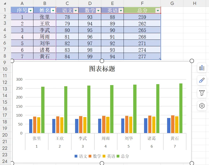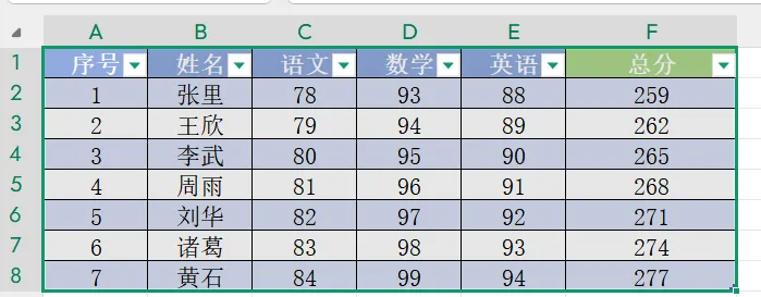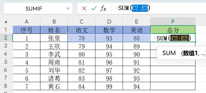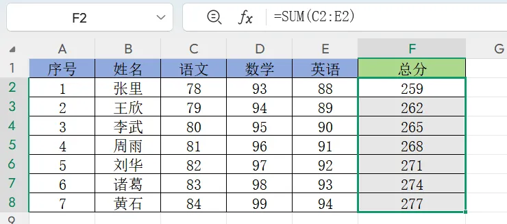 选中F2:F8,按CTRL+D可根据F2的值,快速向下填充,F2时sum求和函数,所以向下填充之后会自动对每行分数求和