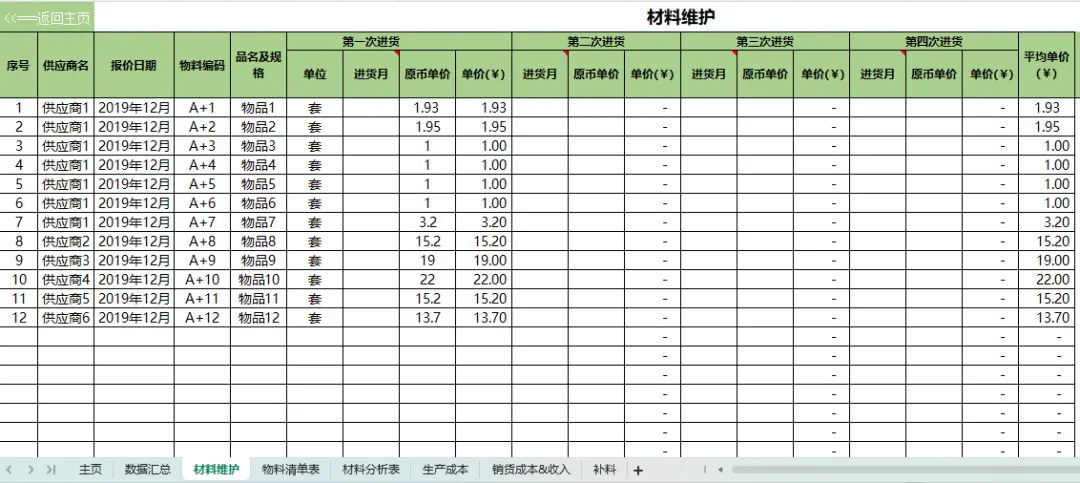 今天分享一套制造业的Excel成本核算管理系统表,直接把材料、人工、费用自动归集,分摊逻辑内置好,数据录入后自动汇总生成产品成本。表格模块包含了:物料清单、销售成本收入表、材料维护表、数据汇总、材料分析表、补料表、生产成本表,可直接套用,不用反复复制粘贴,不用重算比例,直接套用就能出完整成本报表。