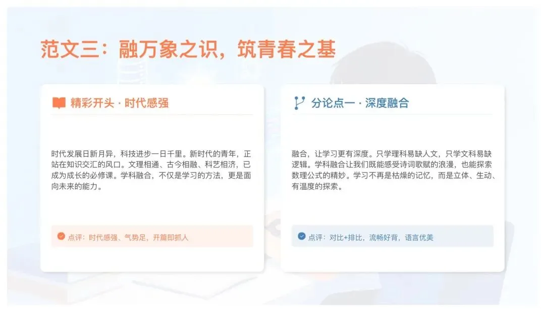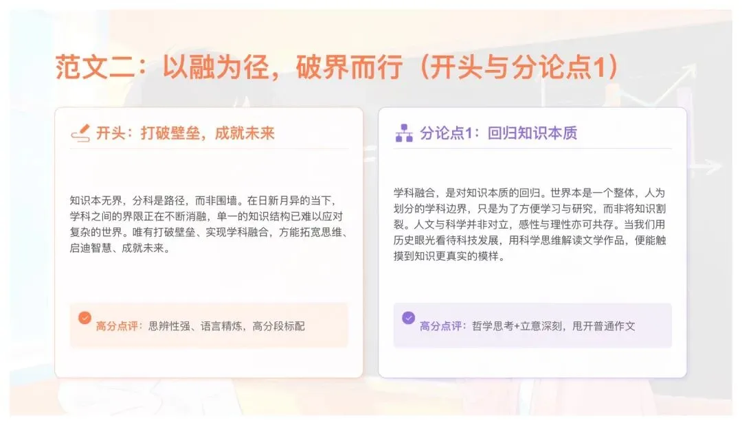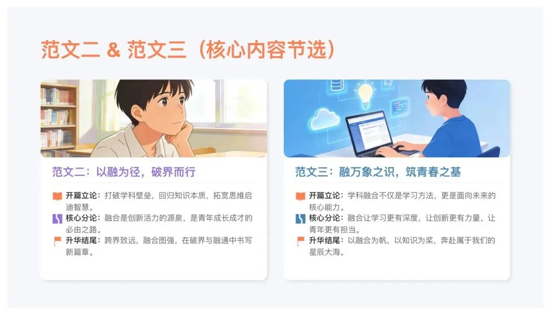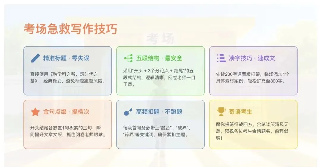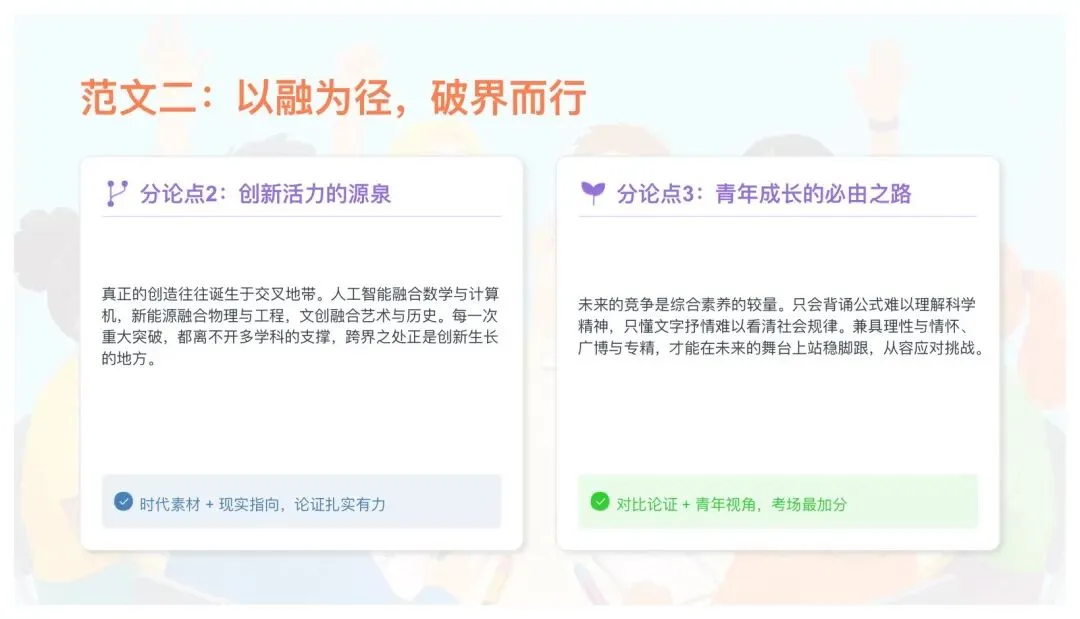 5. 扣题:每段首句必带融合、破界、跨界,绝不跑题。