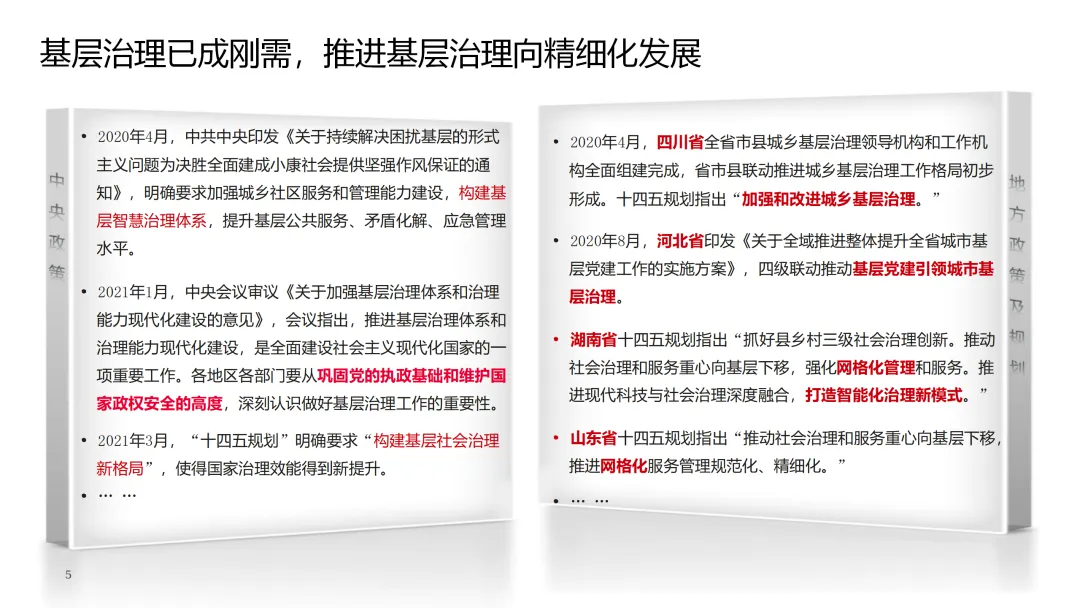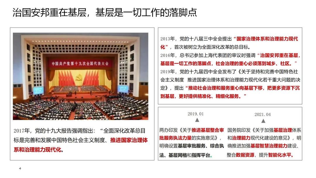 随着国家治理体系和治理能力现代化的深入推进,基层治理作为社会治理的基石,其重要性日益凸显。本数字政府基层治理解决方案,旨在通过科技赋能,全面提升基层治理效能。方案紧密围绕“国家治理体系和治理能力现代化”的总目标,积极响应国家关于基层治理体系和治理能力现代化建设的政策号召。