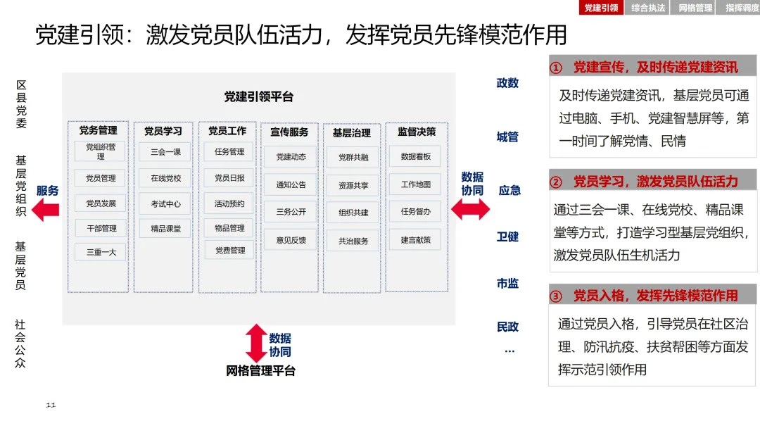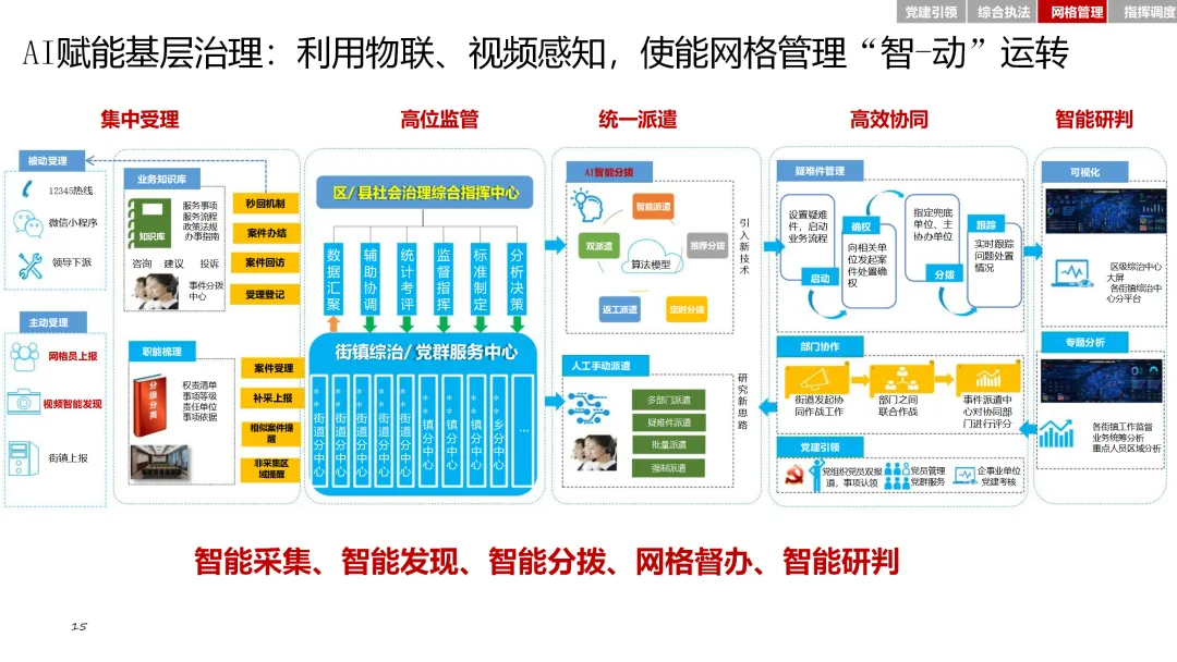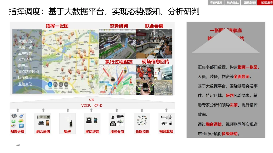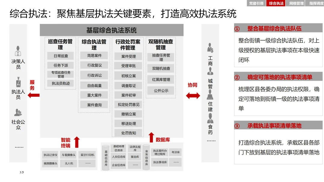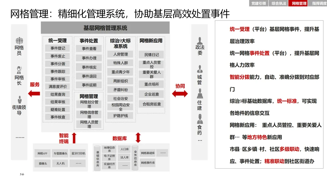在党建引领方面,通过智慧党建平台,加强基层党组织建设,激发党员队伍活力。综合执法模块整合基层执法力量,确定可落地的执法事项清单,提升执法效率和规范性。网格管理模块则通过精细化管理系统,实现对人、房、事、物、组织等要素的全面管理。指挥调度模块则基于大数据平台,实现态势感知、分析研判和应急指挥的智能化。