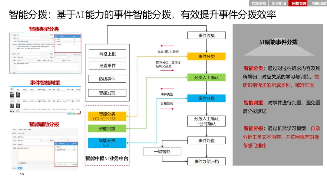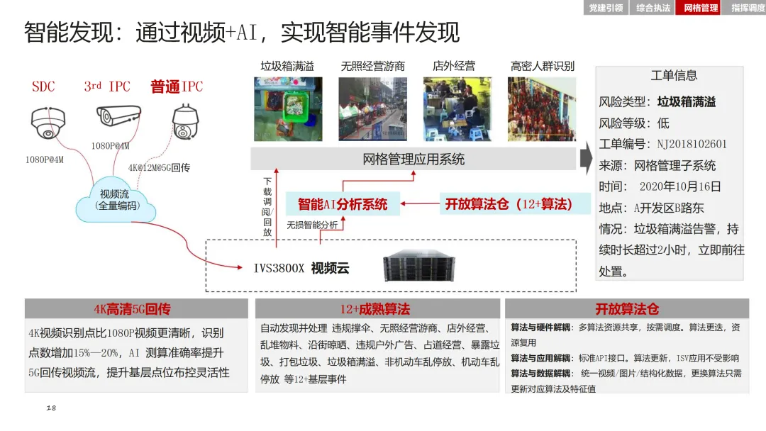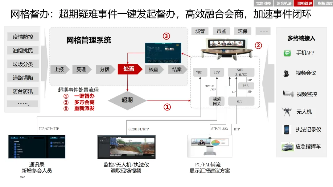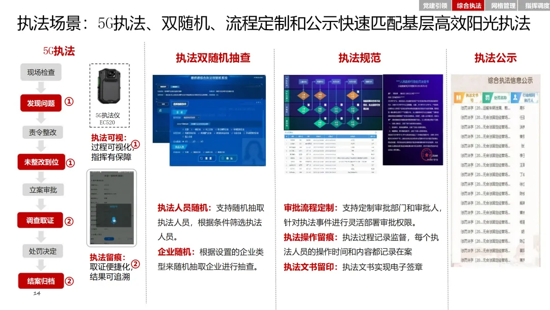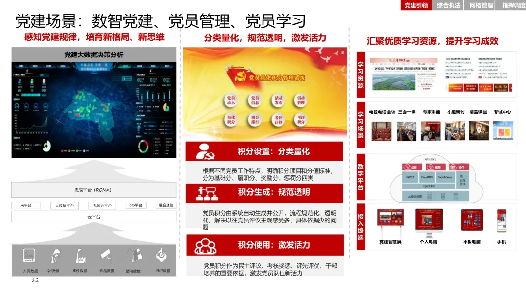 在党建引领方面,通过智慧党建平台,加强基层党组织建设,激发党员队伍活力。综合执法模块整合基层执法力量,确定可落地的执法事项清单,提升执法效率和规范性。网格管理模块则通过精细化管理系统,实现对人、房、事、物、组织等要素的全面管理。指挥调度模块则基于大数据平台,实现态势感知、分析研判和应急指挥的智能化。