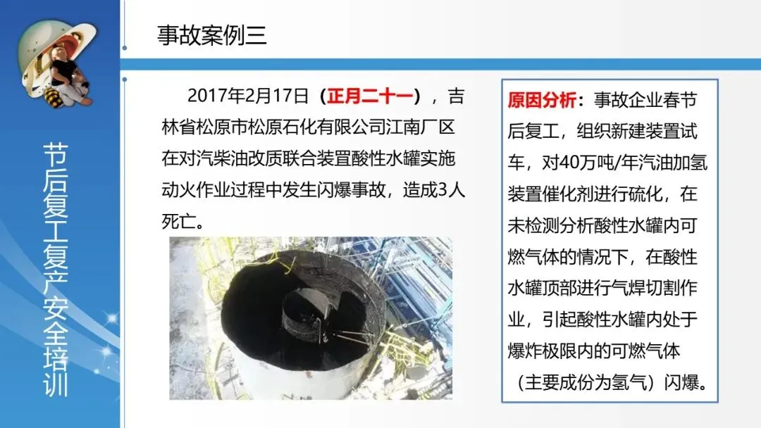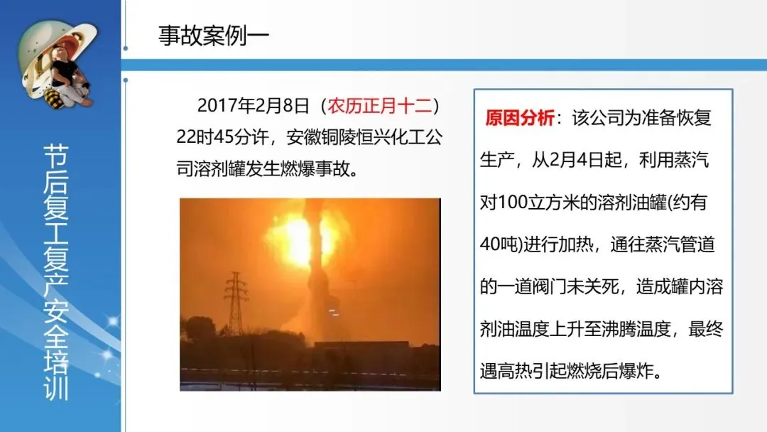 通过多个真实事故案例(如安徽铜陵燃爆、新疆宜化喷料等),深刻揭示节后复工期的高风险特性。事故原因集中体现为设备重启故障、人员操作失误、管理措施缺失,凸显了“节后综合症”(人员身心未归位)与设备隐患叠加的巨大危害,从而论证了开展系统性复工安全管理的极端必要性。