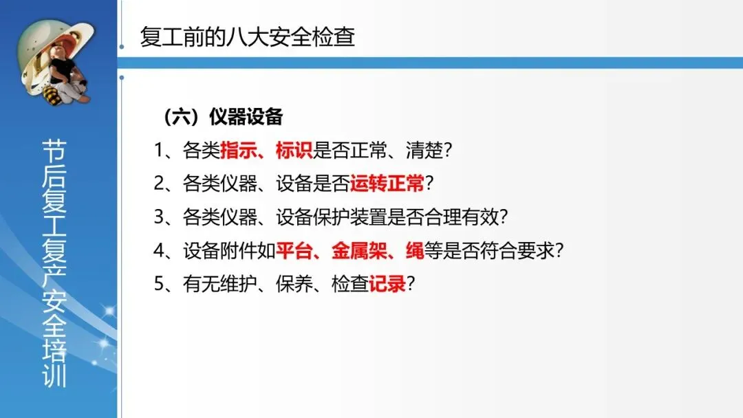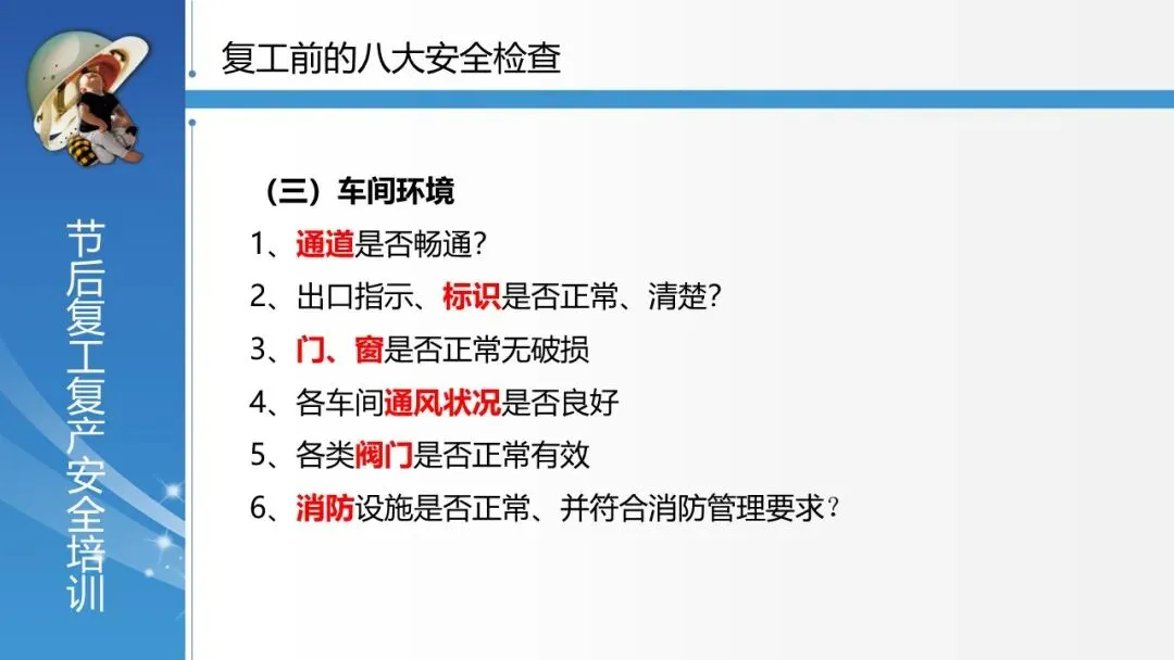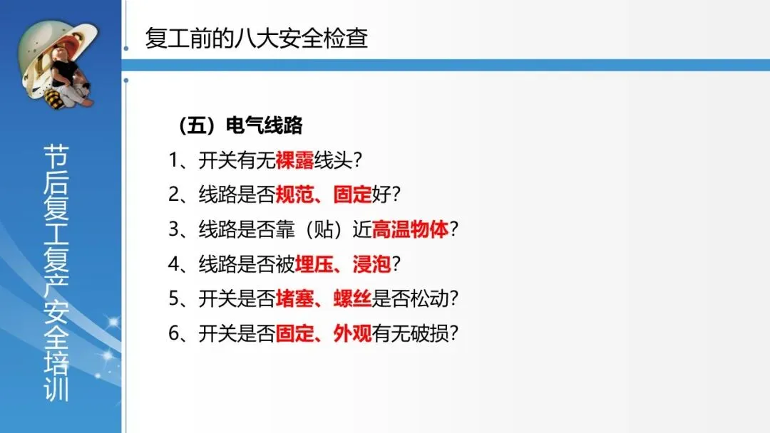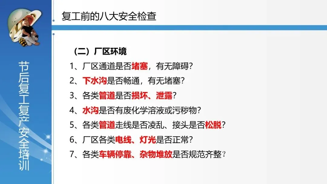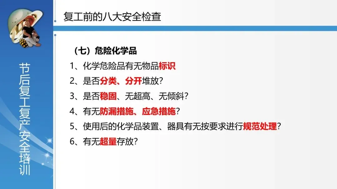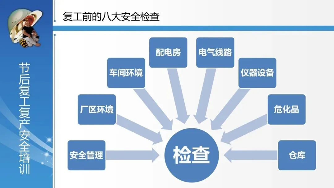 覆盖全面的安全检查体系:系统列出了复工前必须进行的 “八大安全检查” ,涵盖安全管理、厂区环境、车间环境、配电房、电气线路、仪器设备、危险化学品、仓库等各方面,并逐项细化检查要点,极具操作性。