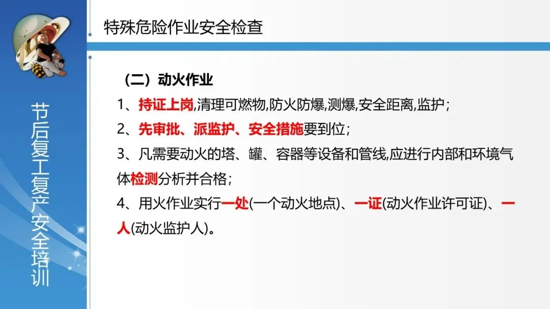 聚焦特殊危险作业管控:针对有限空间、动火、粉尘、高处、吊装、盲板等高风险作业,逐一明确其核心风险和强制性安全要求(如审批、检测、防护、监护),指导负责人进行重点布防。