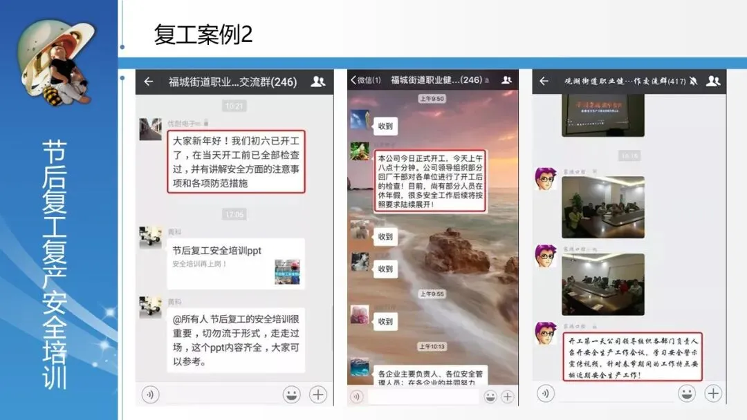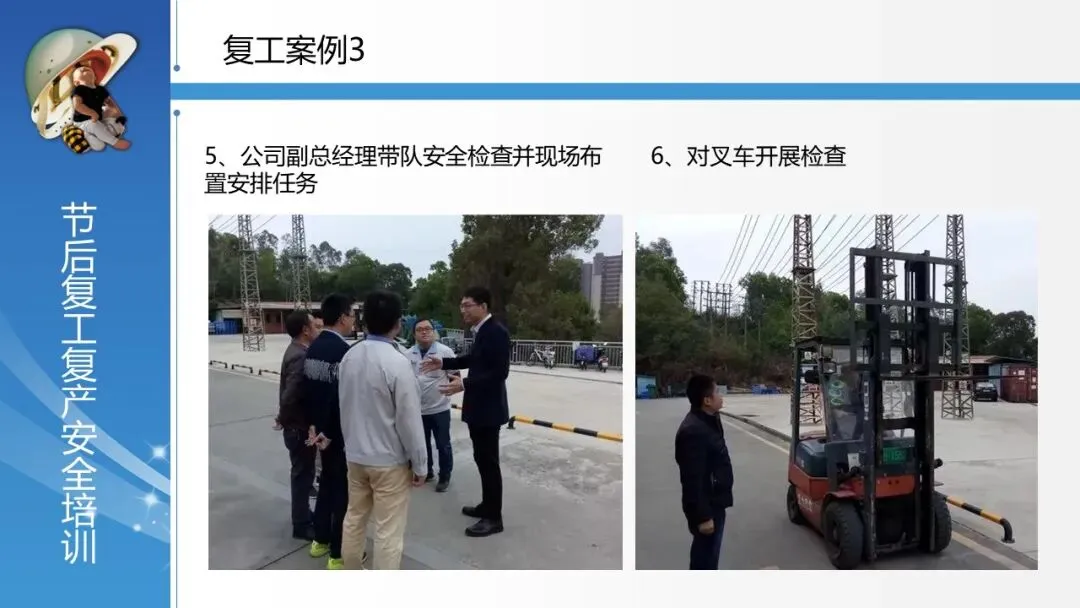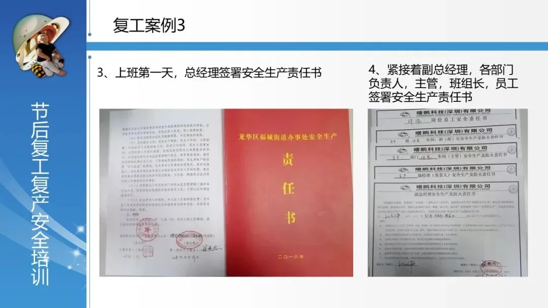 提供优秀复工实践案例:展示了从“开工仪式安全警示”、“逐级签订安全责任书”到“负责人带队检查”、“全员安全培训与警示教育”等一系列可借鉴的复工管理流程,将管理要求融入具体动作。