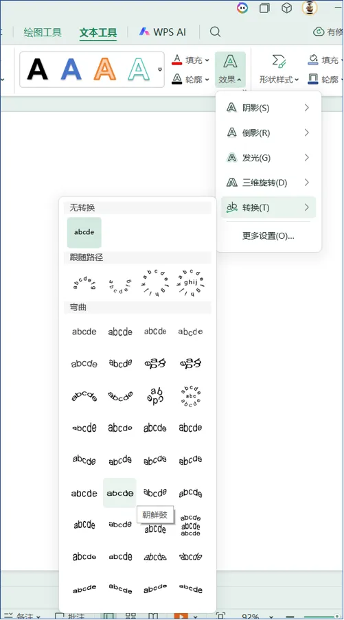2、选中文本框,在文本工具中选择【文字效果】-【转换】-【朝鲜鼓】。