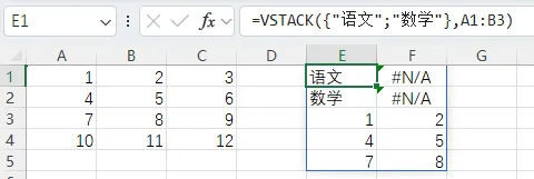这里用VSTACK函数实现纵向的堆放,但是第一个参数是只有一列的纵向数组(分号间隔),所以它先用空值错误(N/A)填充第二列,再和A1:B3堆放在一起。