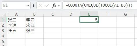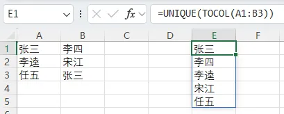 比如某次活动,有人多次扫码签到,现在已经把每个人的扫码信息保存到上面的Excel文件中,怎样去掉重复的人呢?我们可以把数据先用TOCOL函数转化为单列数据,再用UNIQUE去重就可以了。