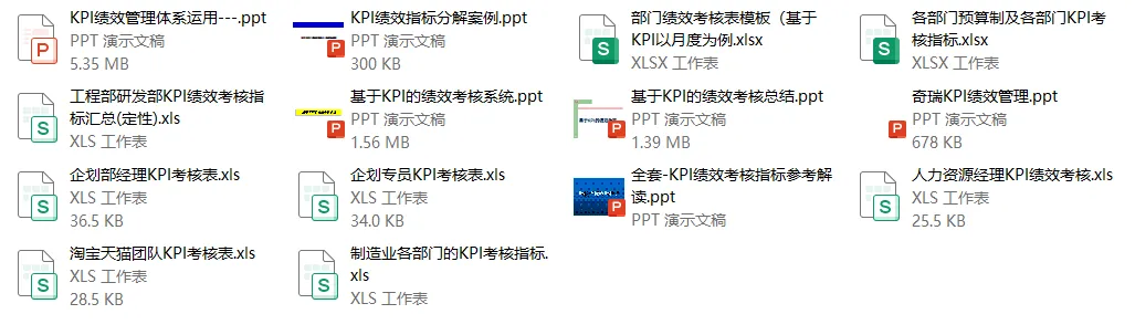 《KPI关键绩效指标资料包》,共14份资料,包括KPI绩效管理体系运用、部门绩效考核表模板、绩效考核表等等。