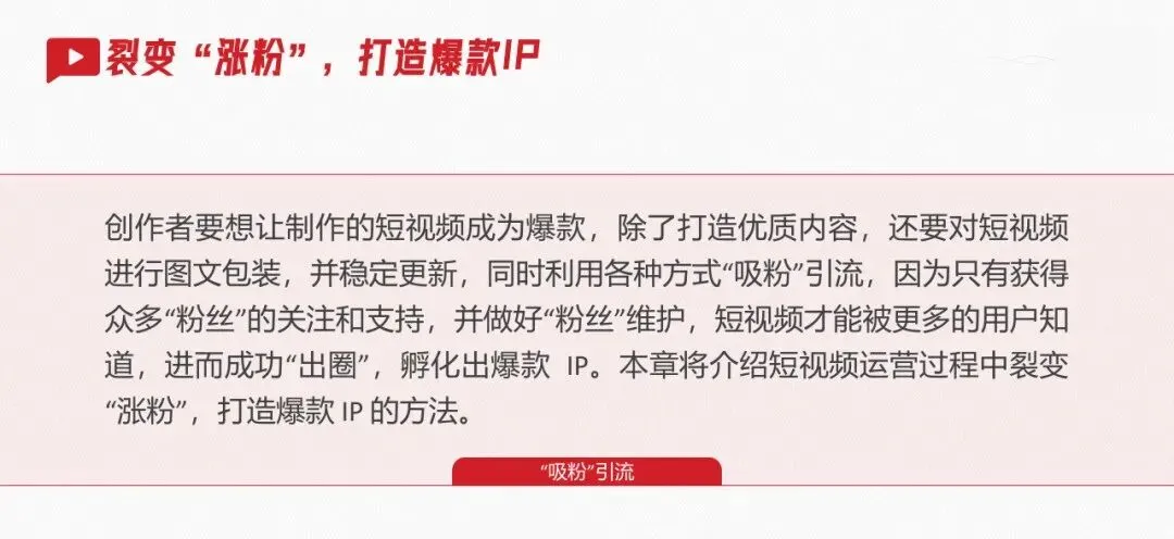 创作者要想让制作的短视频成为爆款,除了打造优质内容,还要对短视频进行图文包装,并稳定更新,同时利用各种方式“吸粉”引流,因为只有获得众多“粉丝”的关注和支持,并做好“粉丝”维护,短视频才能被更多的用户知道,进而成功“出圈”,孵化出爆款IP。本章将介绍短视频运营过程中裂变“涨粉”,打造爆款IP的方法。