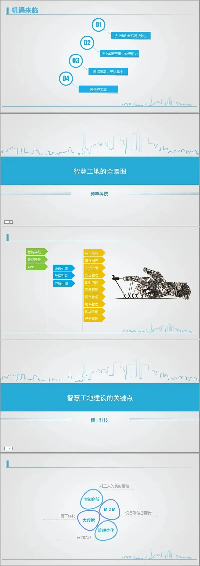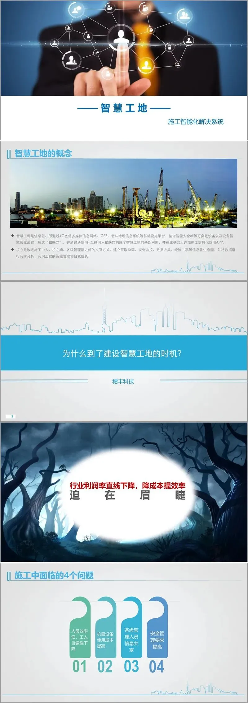 智慧工地以信息化为基础,通过 4G 宽带多媒体信息网络、GPS、北斗地理信息系统等基础设施,整合智能安全帽等可穿戴设备及智能感应装置形成 “物联网”,依托通信网 + 互联网 + 物联网构建基础网络,叠加施工信息化应用工具。其核心是优化施工中人、机、管理层的交互方式,打造互联协同、安全监控、数据收集、经验共享的信息化生态圈,实现工程智能管理与自我成长。当前行业利润率下滑,面临人员效率低、设备成本高、信息共享难、安全要求高四大问题,而其他行业已借物联网、大数据实现变革,传统施工管理 “报价靠想、管理靠骂” 的粗放模式亟待改变,此前因从业者互联网接触少、行业垄断、数据零散、设备成本高导致智慧工地建设滞后,如今技术与需求成熟,发展机遇已至。