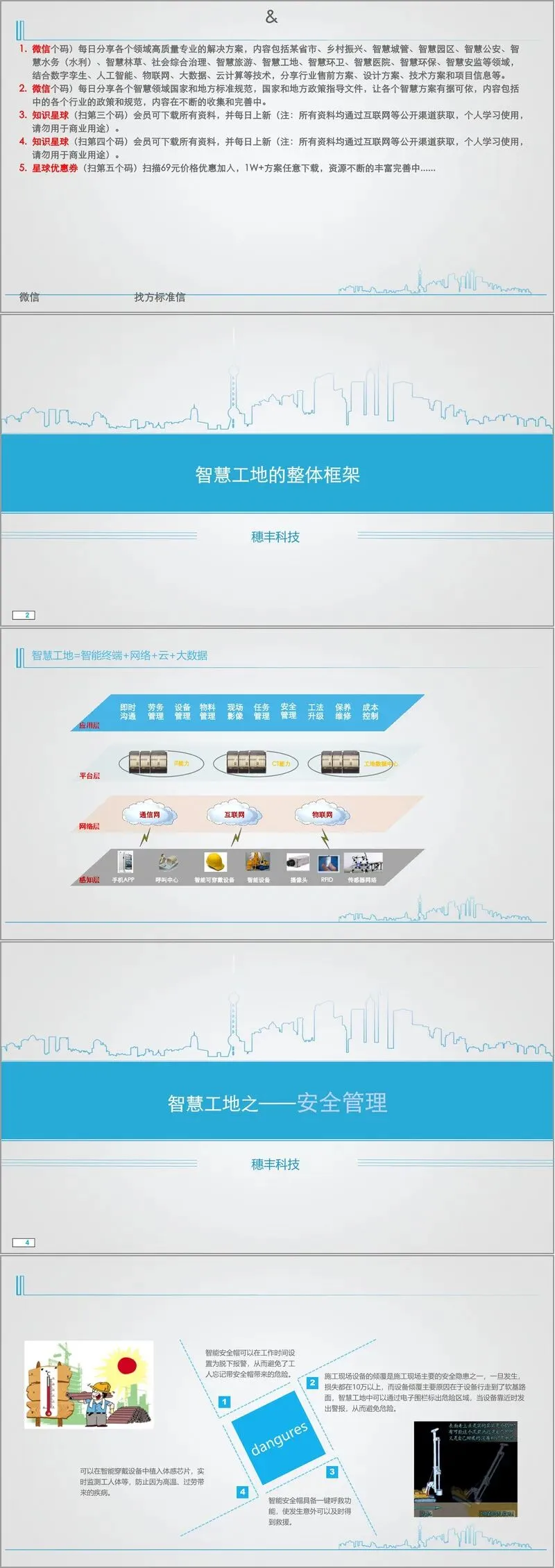 - 整体架构:遵循 “智慧工地 = 智能终端 + 网络 + 云 + 大数据”,分感知层(手机 APP、智能设备、摄像头、RFID、传感器等)、网络层(通信网、互联网、物联网)、平台层(工地数据中心及 IT、CT 能力)、应用层(劳务、设备、物料等管理)。