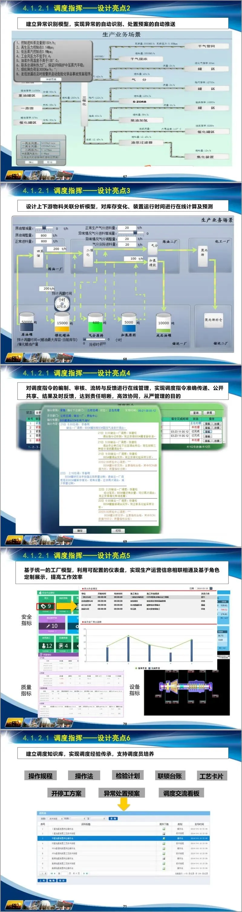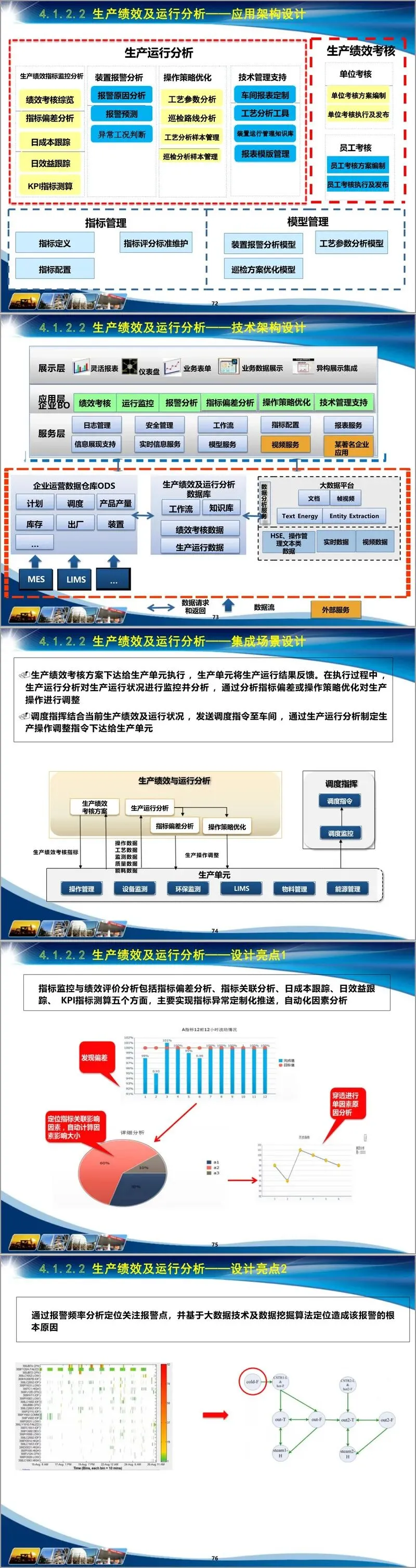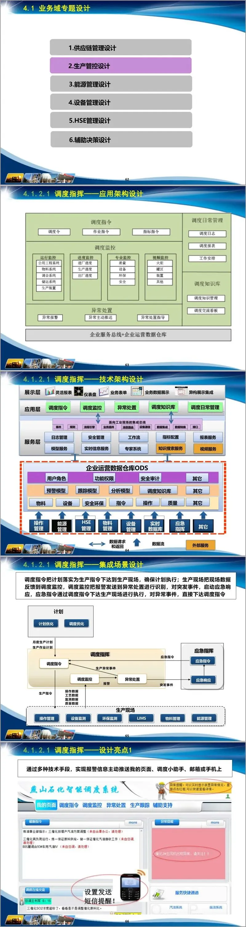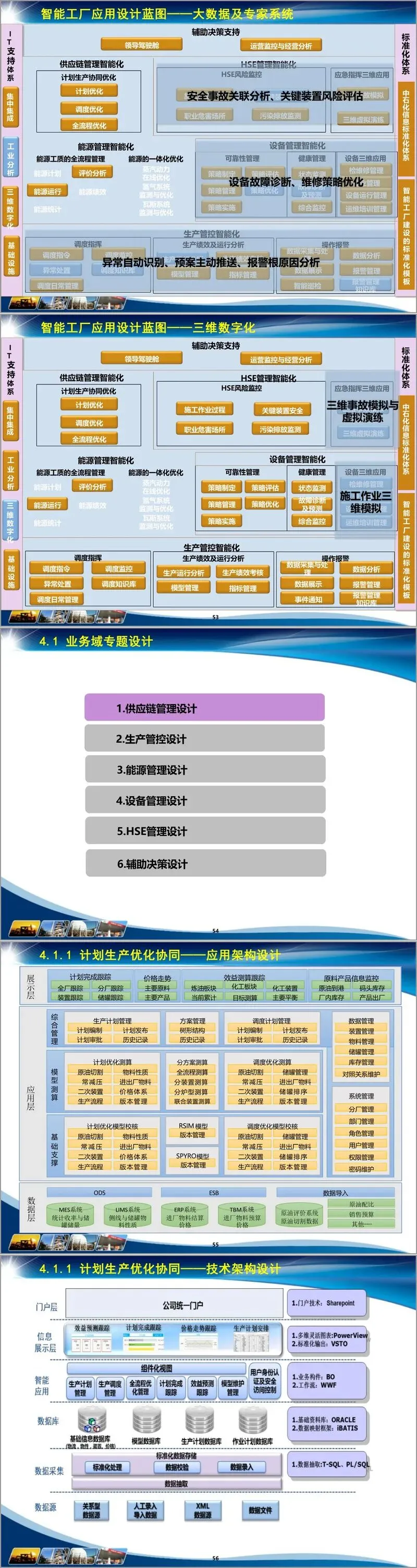在业务域专题设计上,涵盖六大核心领域。供应链管理、生产管控、能源管理、设备管理、HSE管理及辅助决策各有侧重:生产管控细化计划生产优化协同、调度指挥等模块,如计划编制集成场景实现计划、财务、销售联动,调度指挥通过报警推送、异常识别模型提升响应效率;设备管理构建健康管理与可靠性管理体系,借助故障案例库与专家知识库实现故障自动诊断与维修策略优化;HSE 管理聚焦风险监控、作业管控等,运用三维事故模拟与虚拟演练提升应急能力;辅助决策打造领导驾驶舱与移动应用,实现多维度数据挖掘与地理信息集成展示。