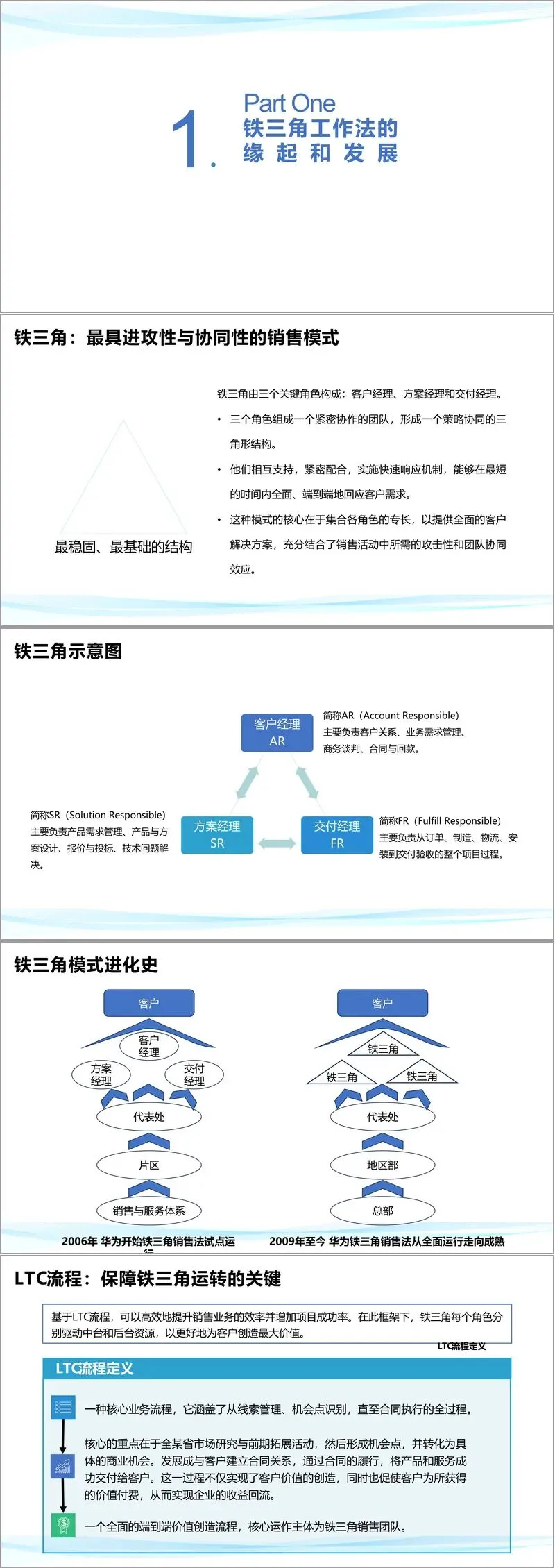 作为支撑华为 8900 亿战绩的核心销售管理法则,华为铁三角工作法以 “聚焦客户需求、协同作战、端到端价值交付” 为核心,构建了一套兼具进攻性与协同性的销售管理体系。这份解密文件系统拆解了铁三角的组织架构、运作流程、激励机制与复制路径,为各类企业打造高效销售团队提供了可落地的实践指南。