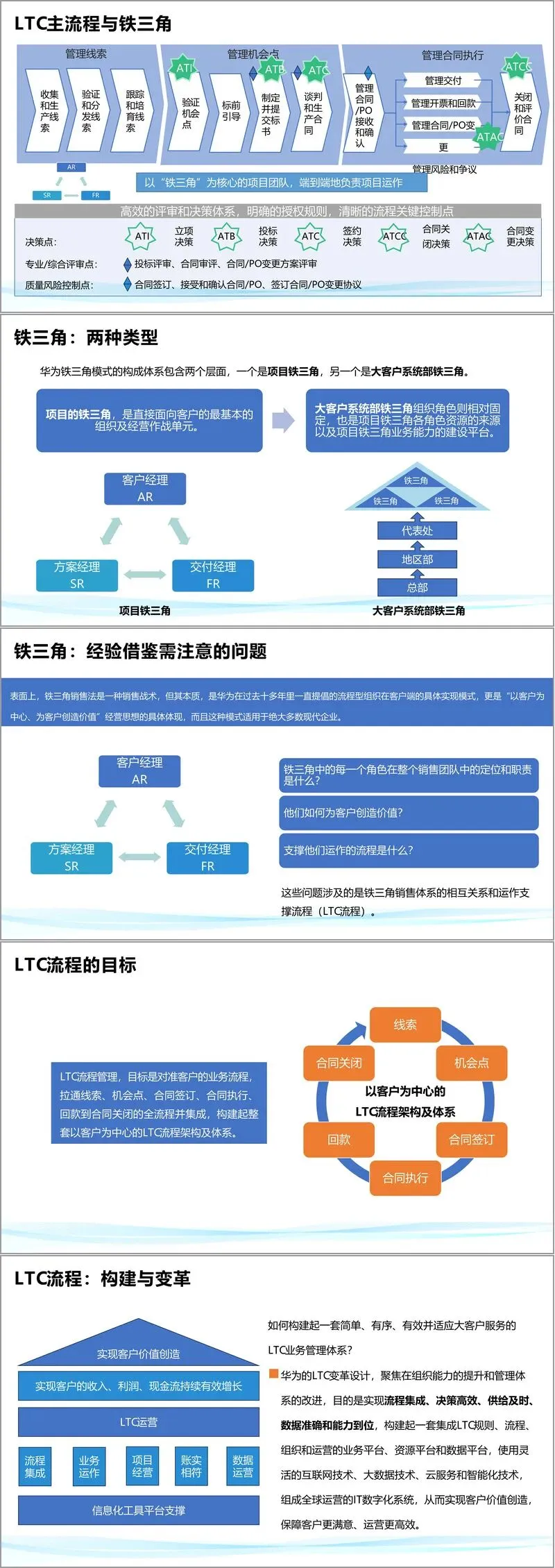 铁三角的复制并非简单的角色拼凑,而是需要从文化、组织、流程、数字化四个维度系统重塑。文化层面需树立 “以客户为中心” 与协同价值导向,打破个人英雄主义思维;组织层面需明确铁三角核心角色与支撑团队,可根据项目阶段分阶段任命项目经理;流程层面需拉通 LTC 全流程,明确各环节责任分工与决策节点;数字化层面需构建前中后台协同的数字化体系,实现营销、交易、办公、采购供应的全流程数字化赋能。华为的实践表明,铁三角的复制还需经历跨部门团队、平台化建设、流程型组织三个发展阶段,逐步实现从协同作战到组织能力的系统性提升。