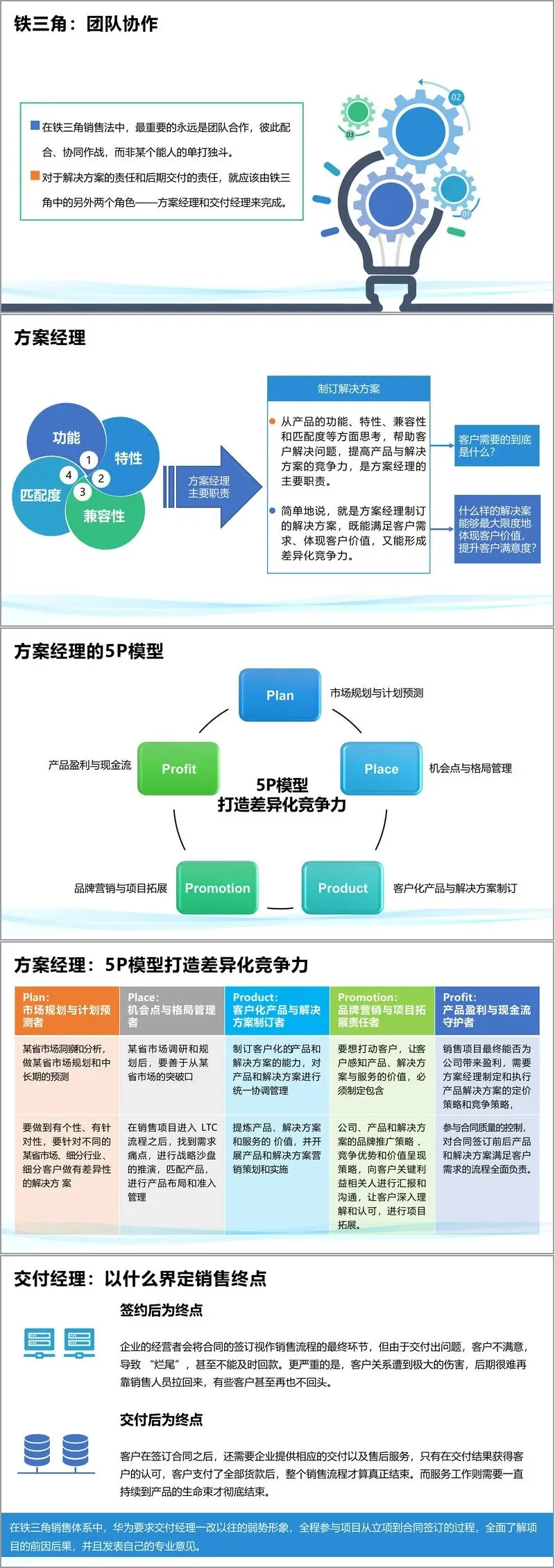 整体而言,华为铁三角工作法的本质是 “以客户为中心” 经营思想的组织化落地,通过明确的角色分工、闭环的业务流程、科学的激励机制与系统的复制路径,实现了销售从 “个人英雄” 到 “团队协同” 的转型。这套方法不仅适用于科技企业,其核心逻辑可迁移至各类 B2B 行业,为企业打造高效协同的销售团队提供了完整的解决方案。