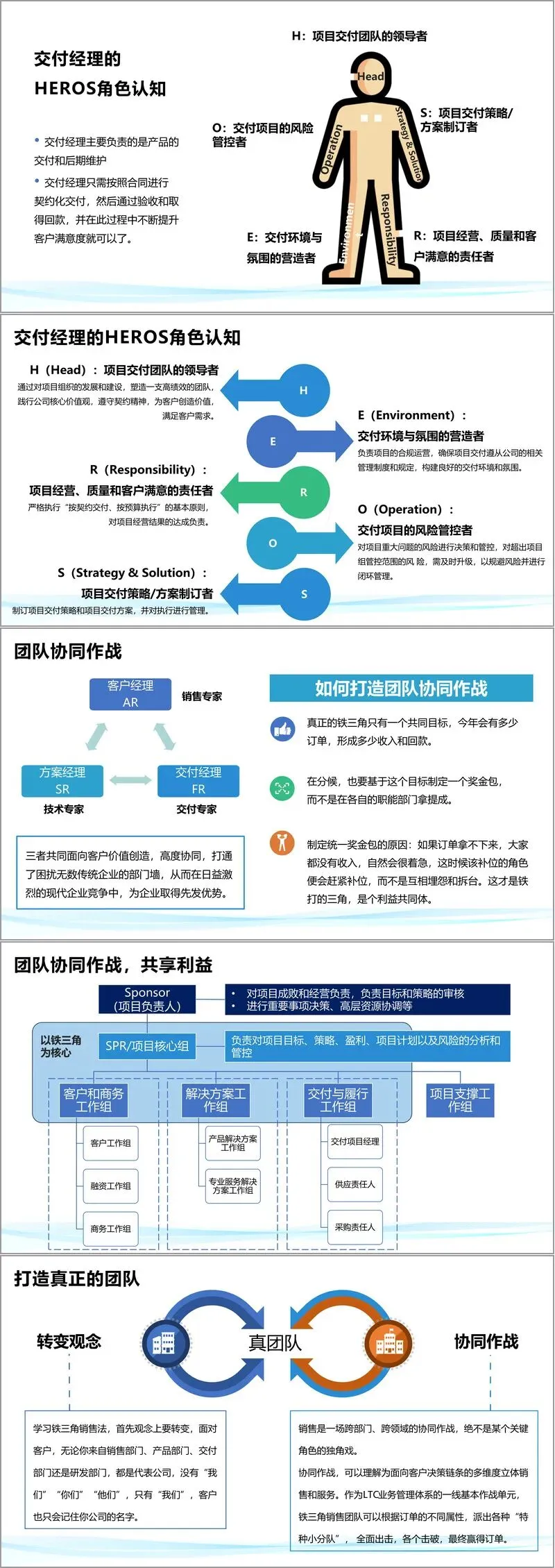 铁三角工作法的核心是由客户经理(AR)、方案经理(SR)、交付经理(FR)组成的紧密协作团队,三者各司其职又高度协同。客户经理作为客户关系的核心维护者,聚焦客户需求洞察、商务谈判与回款保障,需将 80% 时间投入客户对接,第一时间捕捉机会点;方案经理负责产品解决方案设计、报价投标与技术问题解决,通过 5P 模型(市场规划、机会格局、产品方案、品牌推广、盈利保障)打造差异化竞争力;交付经理全程参与项目立项至验收全流程,以 HEROS 角色(领导者、环境营造者、责任者、风险管控者、策略制定者)保障合同履约与客户满意度。这种 “三位一体” 结构打破了传统部门墙,让客户感受到统一的企业界面。