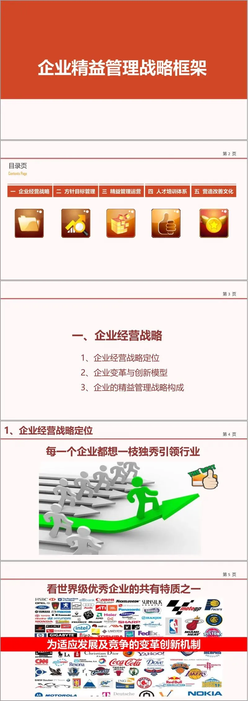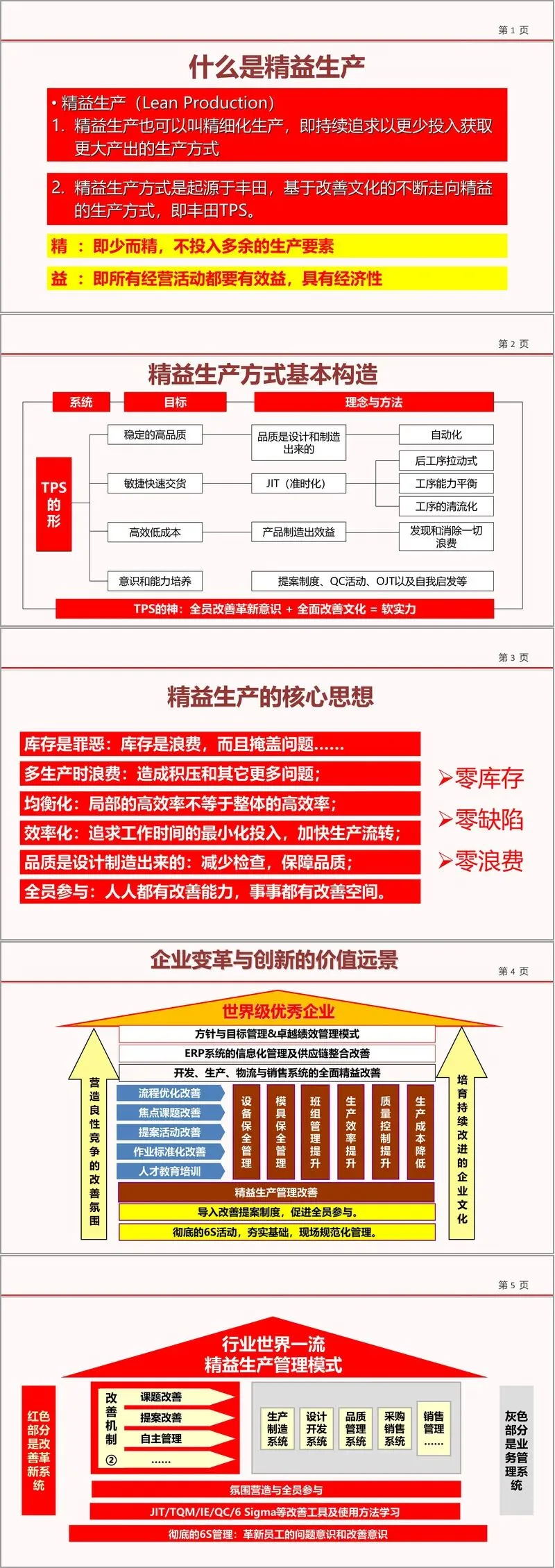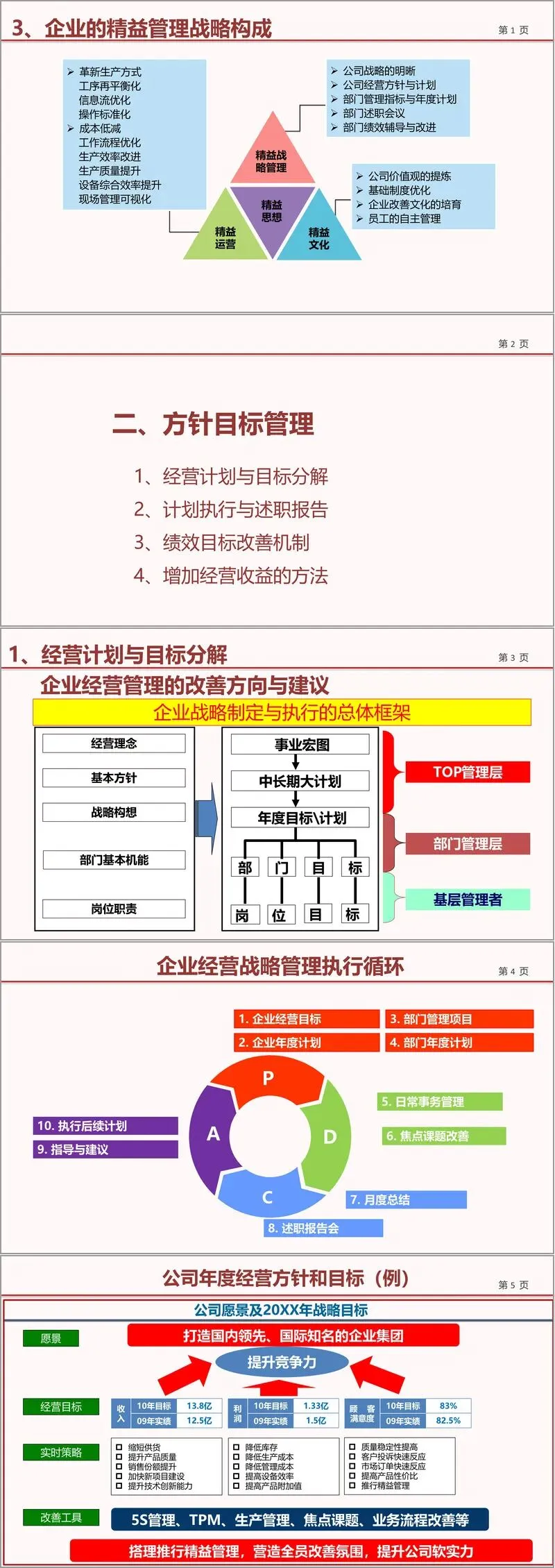 企业经营战略是精益管理的顶层指引。框架将企业划分为利益驱动型、职业发展型、组织信仰型三类,指出优秀企业需兼顾技术创新与管理创新,通过持续培育企业文化实现长期成长。精益管理战略核心包含四大要素:精益思想强调以更少投入获取更大产出,消除一切不产生价值的浪费;精益战略管理需明确公司愿景、分解经营目标,形成部门与个人的联动计划;精益运营聚焦生产方式革新、成本低减、效率提升等实际业务;精益文化则通过价值观提炼、制度优化、改善氛围营造,筑牢精益管理的思想基础。其中,丰田 TPS 的 “自働化” 与 “JIT”(准时化)模式被作为标杆案例,凸显了长期坚持与全员参与的重要性。
