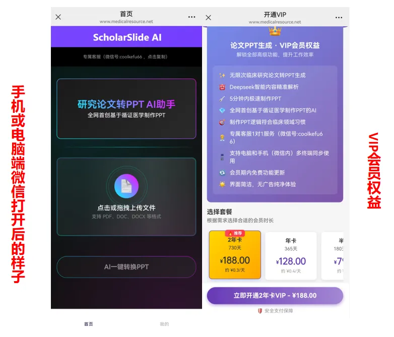 研究论文转PPT AI助手(网站)如何使用?目前的版本是在微信内使用(手机或电脑,建议在电脑中操作)【需要指导操作,加客服微信coolkefu66】,后续会上线直接在浏览器使用的版本。- 在电脑上复制网址:https://www.medicalresource.net/ ,然后发到微信中(如:发给文件管理助手),然后打开,就能看到下方界面: