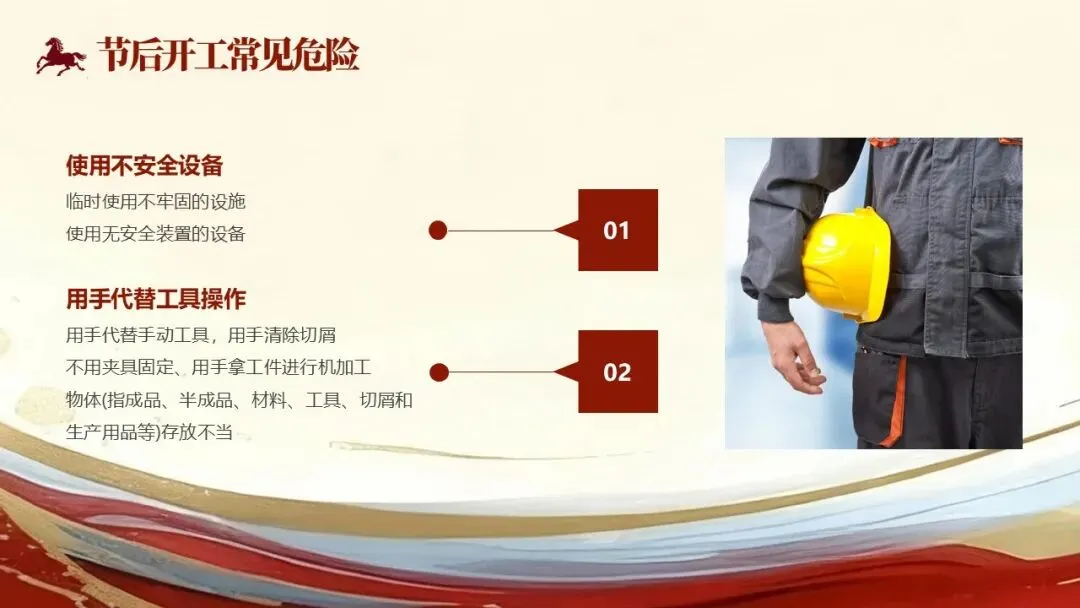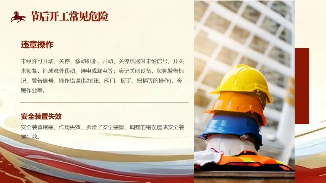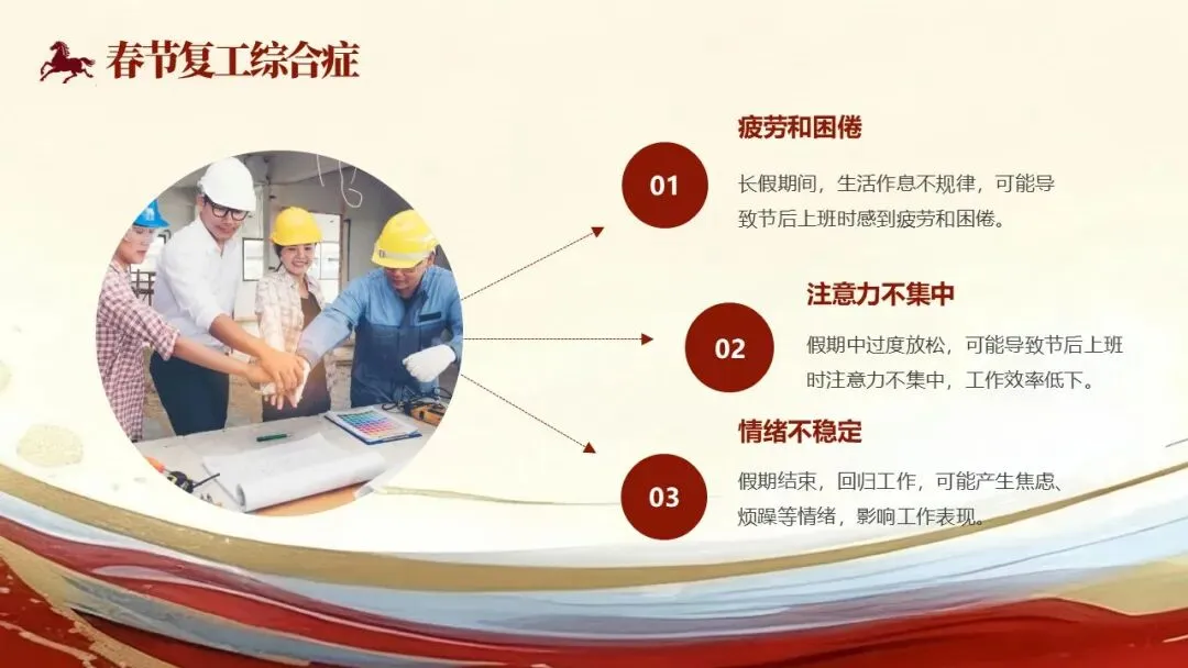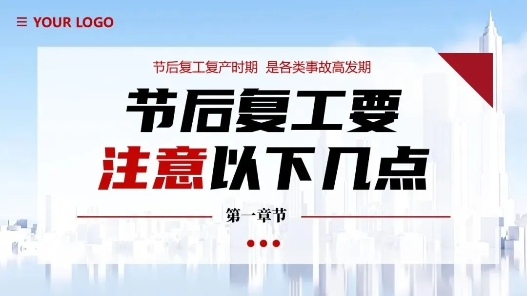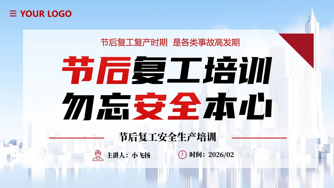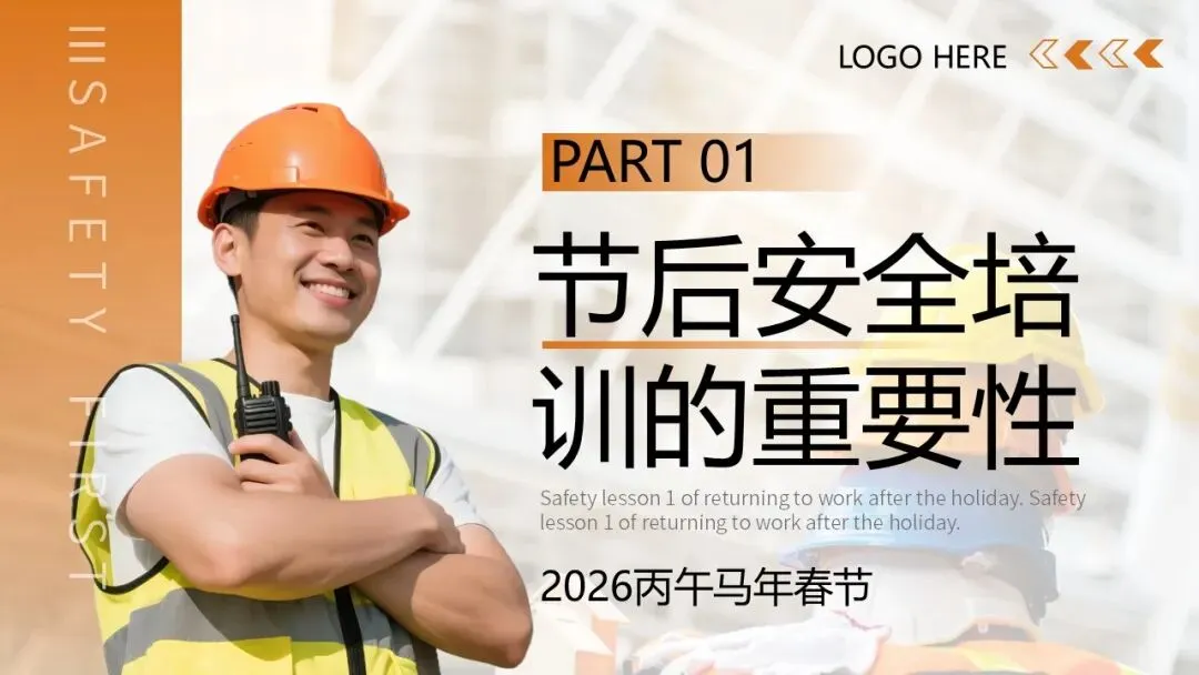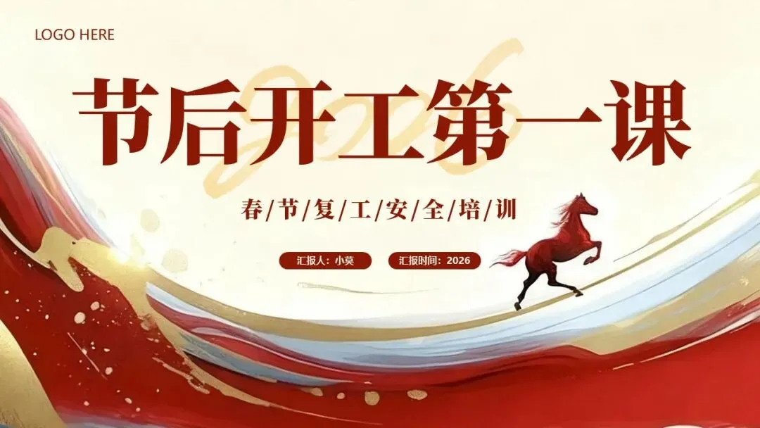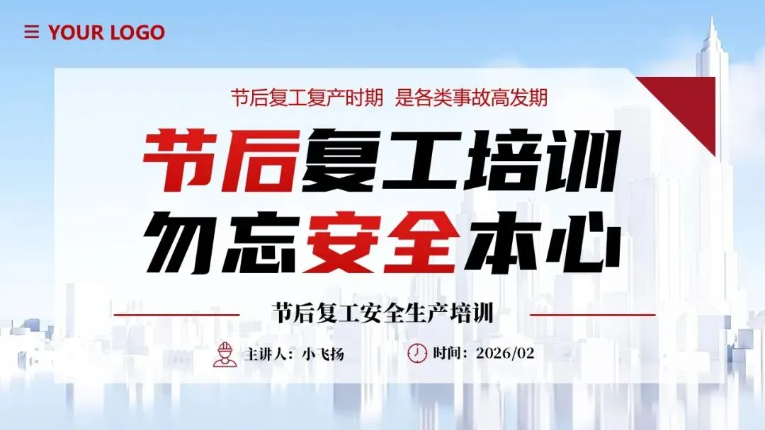 还有2两天就要迎来2026年春节了,这里给各位老师和同学们拜个早年,祝大家都能够在2026年工作顺利、万事如意,也谢谢大家的支持!这次给各位带来几款关于节后复工复产相关的培训课件,全部都是带有现成的示例内容和框架结构的,大家都知道节后会有很多人还没有从节日的氛围中走出来,尤其是春节,很多人过完春节后,会有一些诸如节后综合征的反应,很难立即从春节的状态调整为工作状态,这时如何做好节后复工的培训就显得尤为重要,希望这几款课件能够助力各位老师的节后复工培训工作!01.节后安全培训的重要性