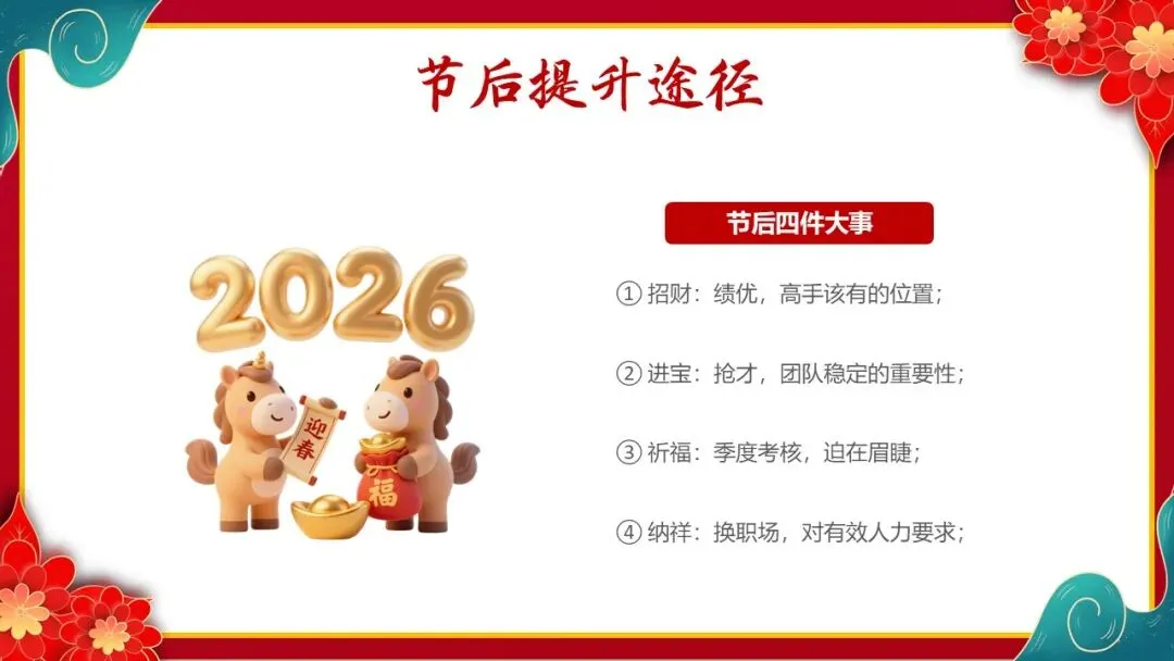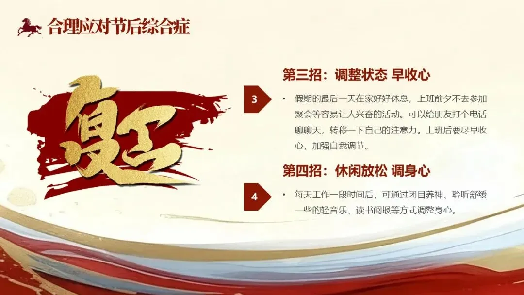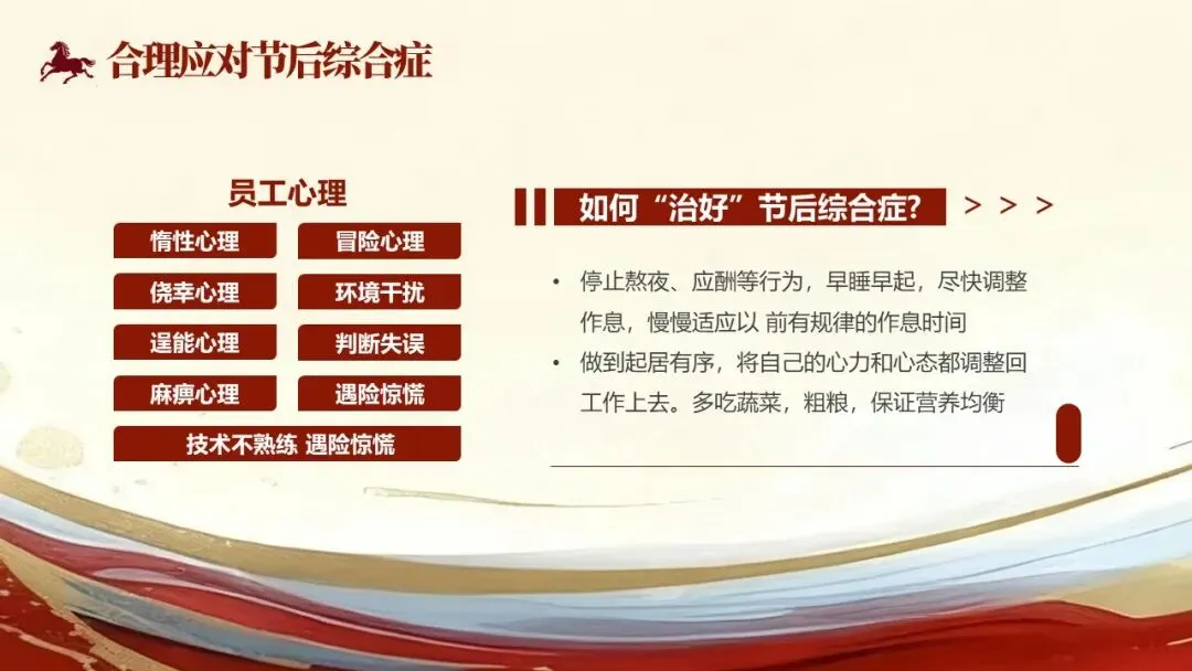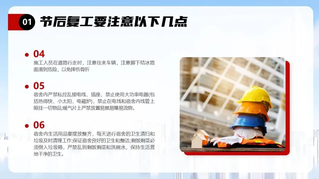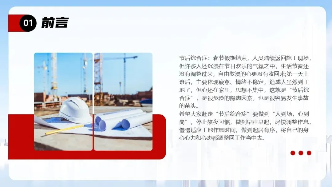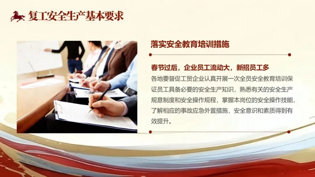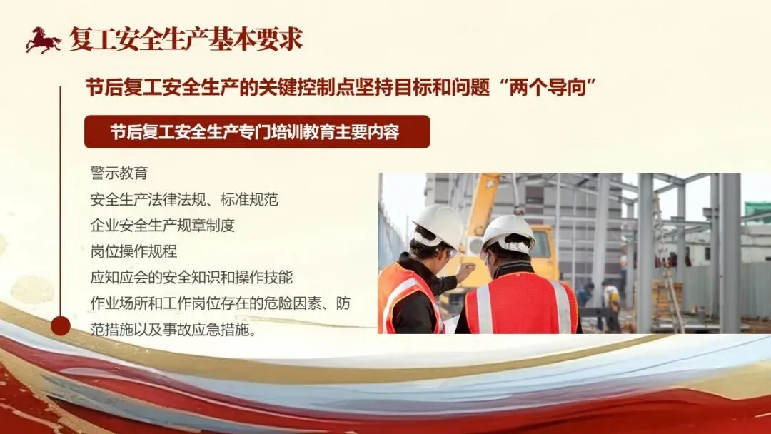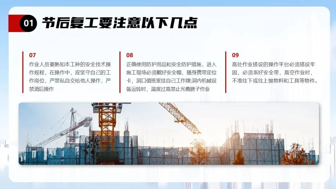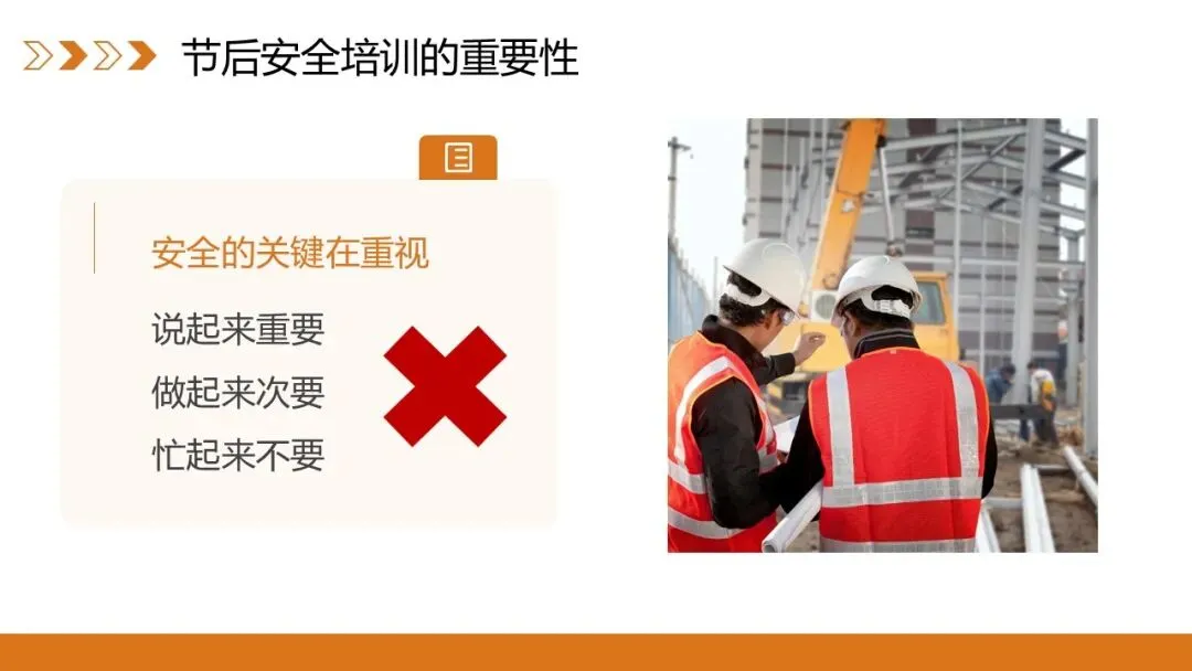 还有2两天就要迎来2026年春节了,这里给各位老师和同学们拜个早年,祝大家都能够在2026年工作顺利、万事如意,也谢谢大家的支持!这次给各位带来几款关于节后复工复产相关的培训课件,全部都是带有现成的示例内容和框架结构的,大家都知道节后会有很多人还没有从节日的氛围中走出来,尤其是春节,很多人过完春节后,会有一些诸如节后综合征的反应,很难立即从春节的状态调整为工作状态,这时如何做好节后复工的培训就显得尤为重要,希望这几款课件能够助力各位老师的节后复工培训工作!01.节后安全培训的重要性