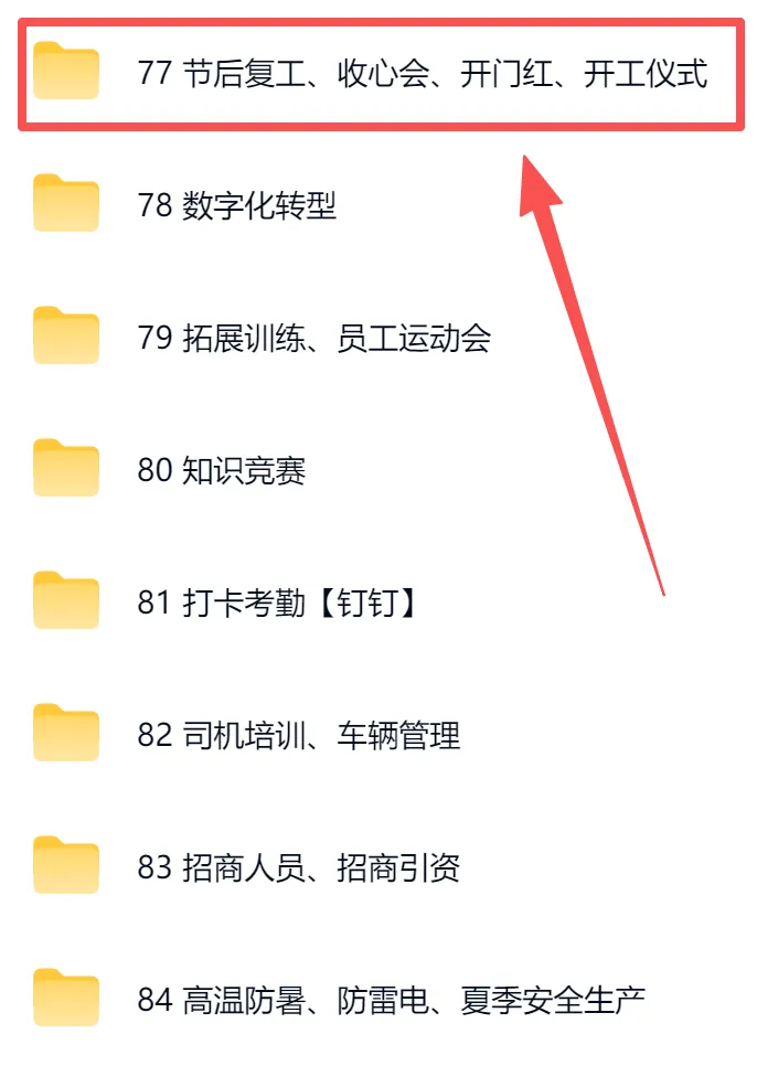在编号77的文件夹里,名为"节后复工、收心会、开门红、开工仪式"的文件夹里,就有,大家对着文件预览图查找即可,预览图的名称和文件的名称是对应的