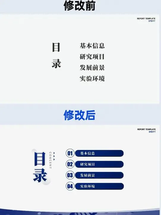 目录页的优化更显专业逻辑:修改前仅简单罗列 “基本信息、研究项目” 等标题,无视觉引导;修改后用 “01-04” 清晰划分章节层级,版式规整度与学术严谨感瞬间提升。