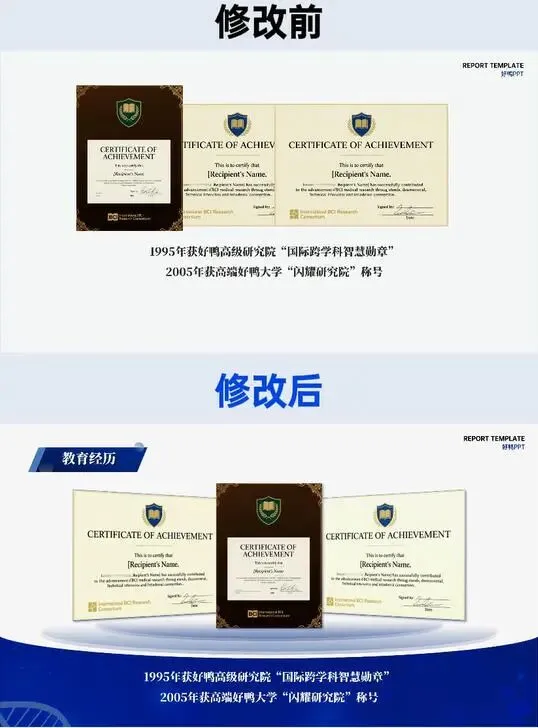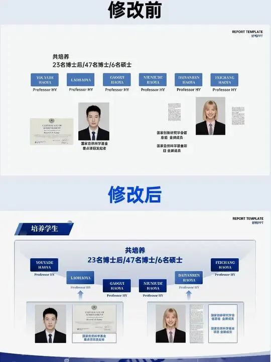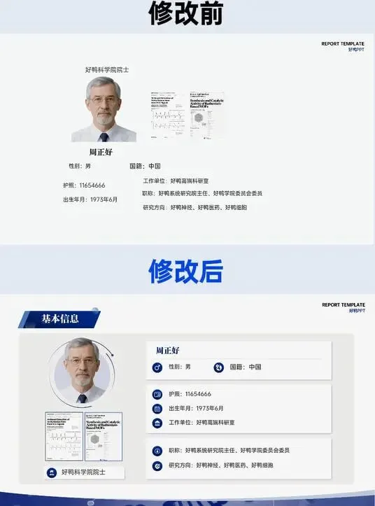 修改前的基础信息页,内容堆砌无章法,信息混排,关键身份标识被淹没;修改后以 “基本信息” 为明确标题统领,按 “个人信息 - 工作单位 - 职称 - 研究方向” 逻辑分层排布,头衔置于页尾强化权威感,视觉动线清晰,评委 3 秒即可抓取核心信息。
